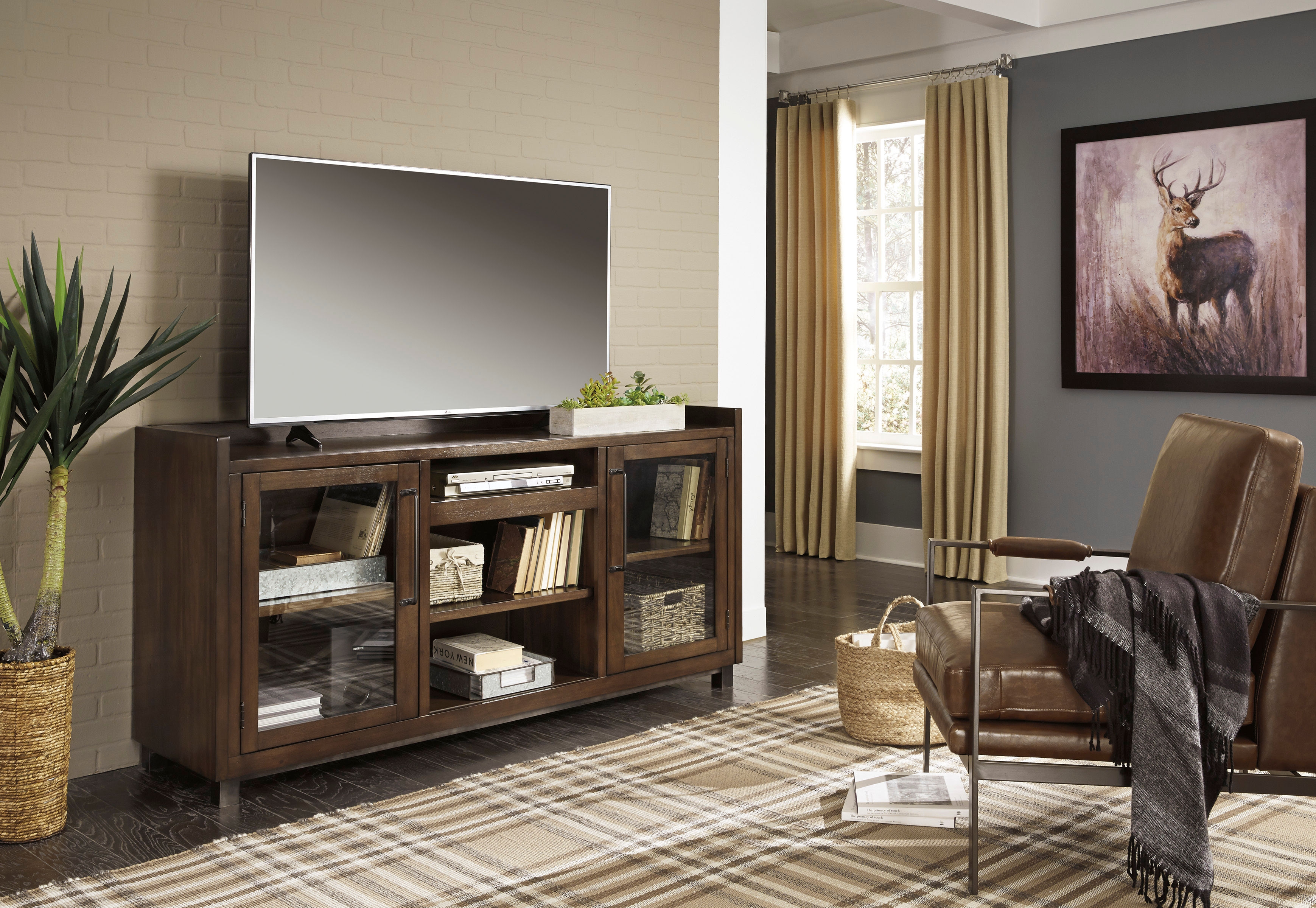 For fans of urban industrial design, the Starmore XL TV stand clearly steals the show. Its blend of acacia veneer and wood is beautified with an oiled walnut-tone finish for a highly contemporary aesthetic with grainy, earthy character. Infusion of dark bronze-tone metal takes the cool character to another level. And for your added viewing pleasure, this entertainment center is compatible with our electric fireplace inserts (sold separately).