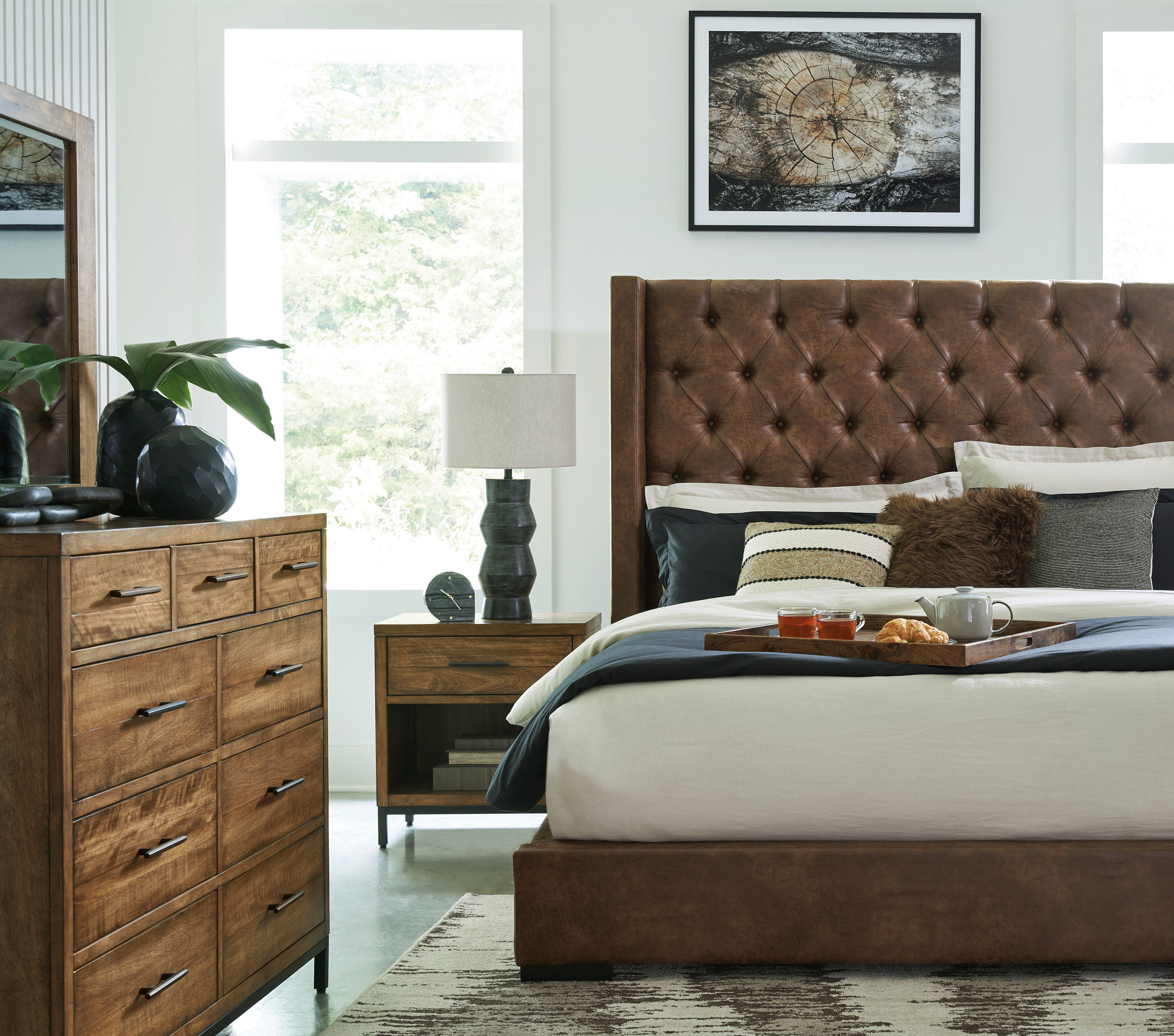 Cool, chic and crafted for the everyday, this queen upholstered bed is well-suited to your urban contemporary character. It pairs rich brown faux leather with a low profile and tufted details for a luxe industrial feel. And with its neutral hue, staging this bed with existing pieces is nearly effortless. How’s that for relaxed refinement?