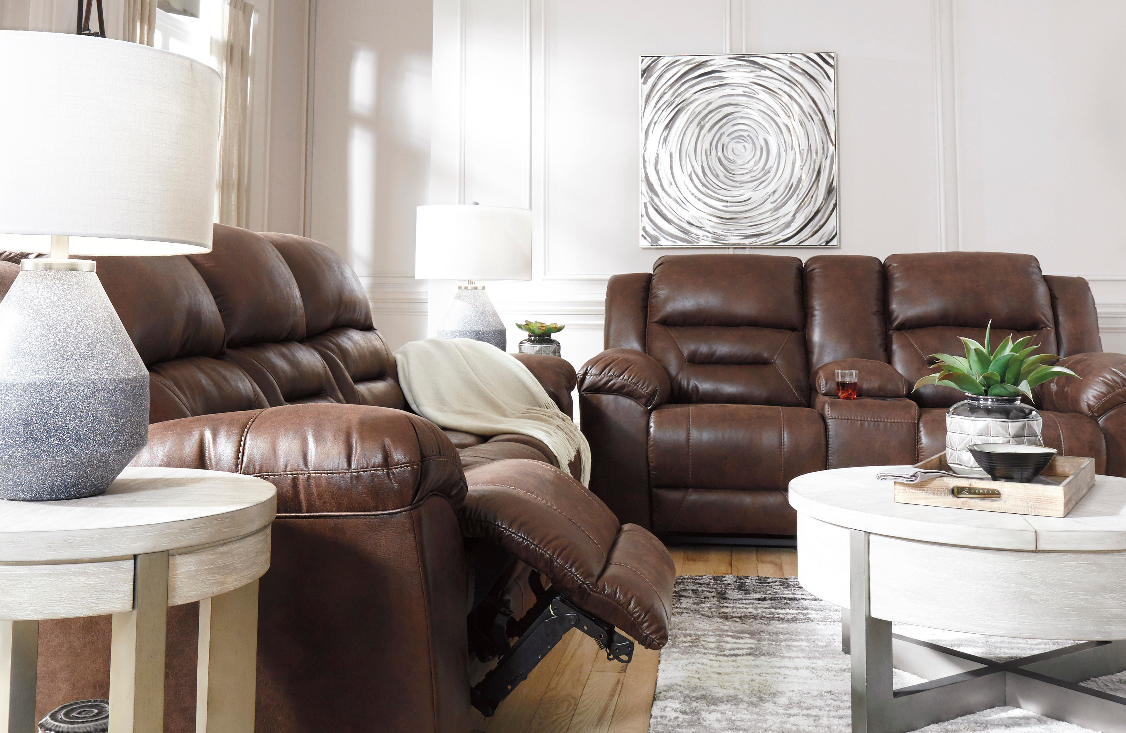 For those that love the cool look of leather but long for the warm feel of fabric, the Stoneland power reclining sofa delivers both with ease. Its high-performance padded faux leather is remarkably durable and easy to clean, just the thing for family spaces. When it’s time to relax, the one-touch power control puts the perfect position at your fingertips. Channel-stitched back cushions provide indulgent lumbar support for maximum seating comfort—not to mention fashion-forward flair.