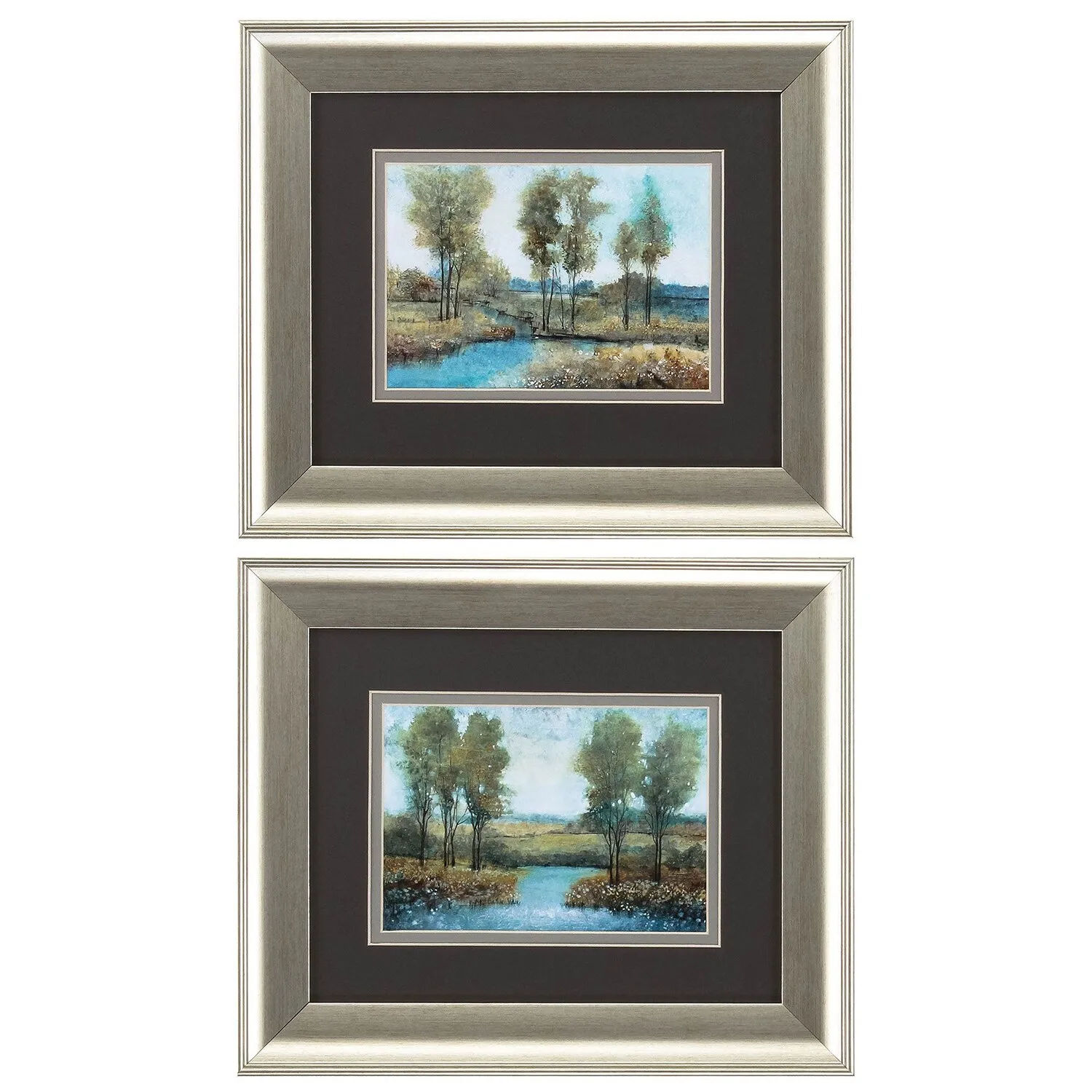 Set of two landscape prints that are double matted, under glass and finished with a complimenting brushed silver frame.
