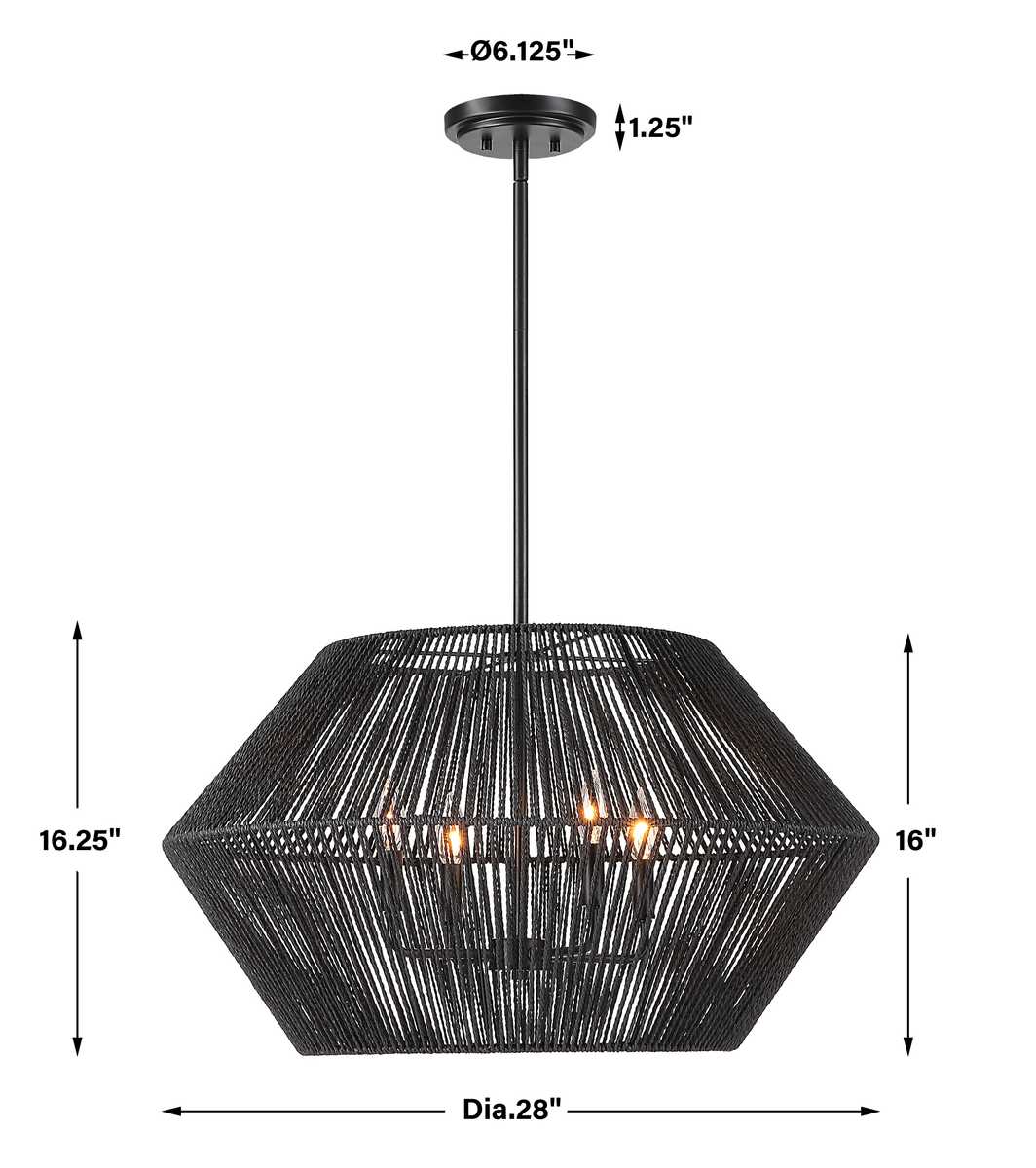 Natural rope is hand wrapped and dyed a chic black to form the shade of our 4 Lt pendant giving both an adventurous & dressed up feel in matte black. 4-60 watt max candelabra sockets. Bulbs not included. Supplied with 15' wire, 3-12" stems and 1-6" stem for adjustable installation.