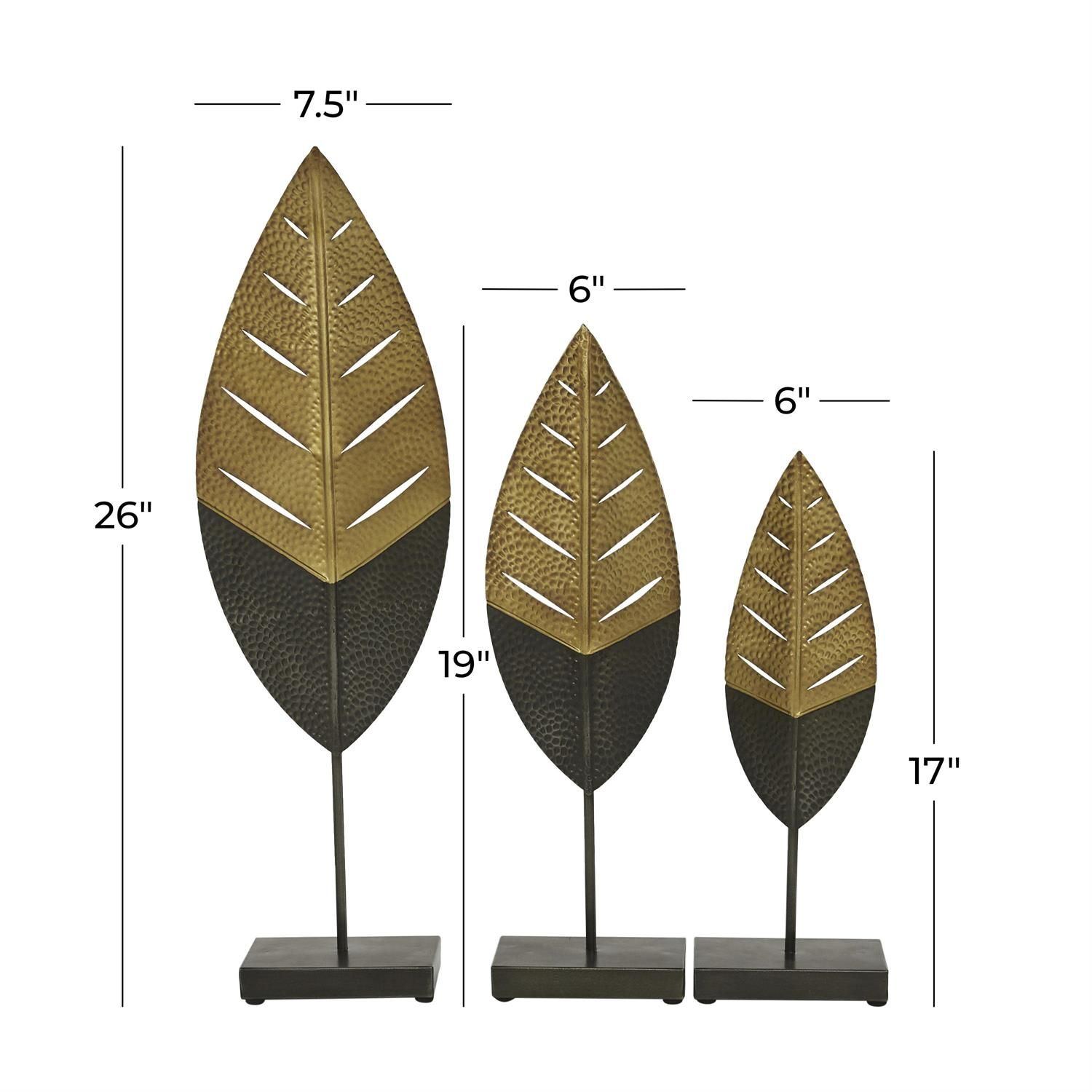 Embrace artistic expression with a style that highlights bold designs with sleek lines, neutral elements, and a minimalist aesthetic. This modern-inspired gold decorative sculpture set is crafted with solid iron for durability. The black and gold color combination gives this oval decorative statue set a sophisticated feel, enhanced by its satin finish. Iron set of 3 sculptures features individual leaf patterns with linear perforated and hammered details, adding a unique touch.