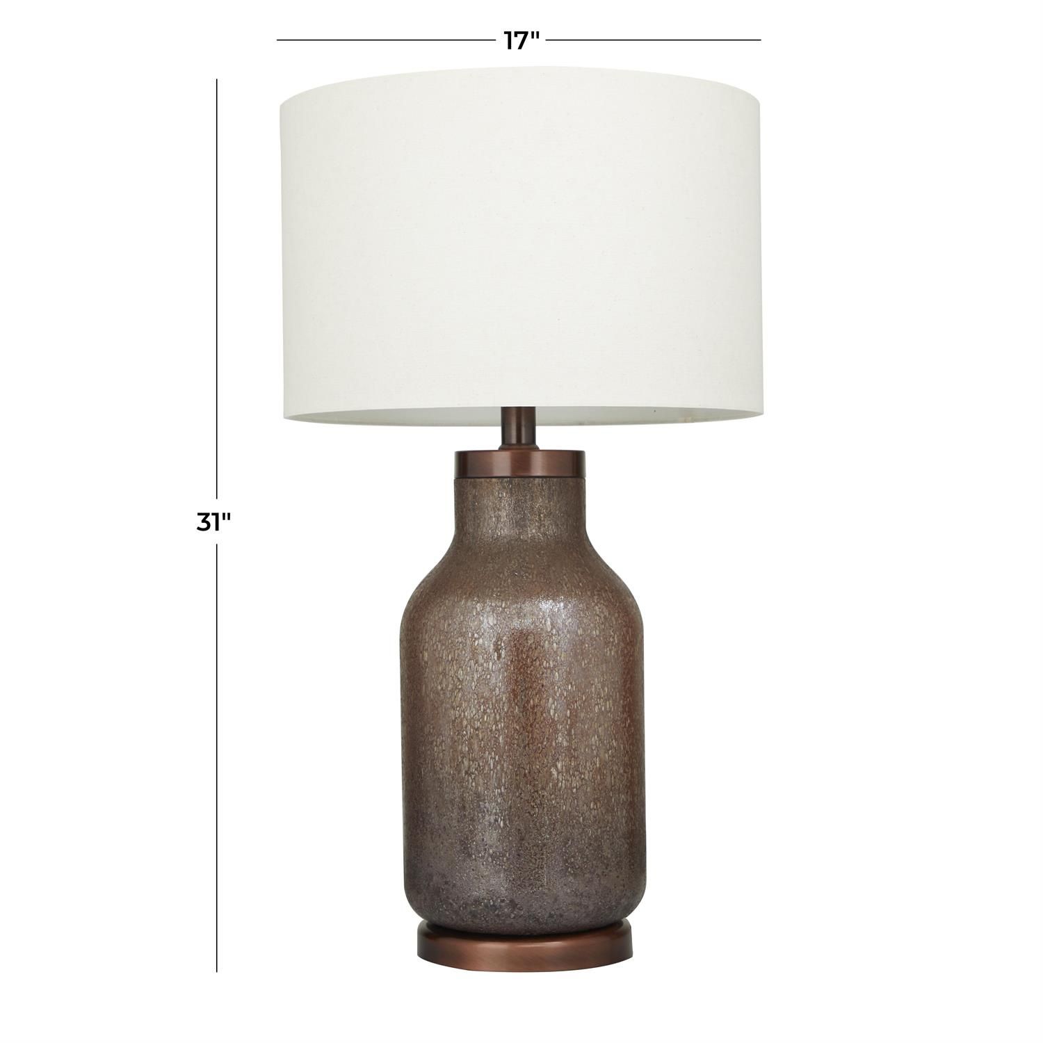 Inspired by sleek elegance and clean lines, a minimalistic design offers effortless luxury with monochromatic tones and bold, angular structures. White and brown accent table lamp made of solid and quality glass, fabric, and iron materials. Decorative table lamp with white and ombre brown finishes perfect for a modern-inspired home. A modern table lamp featuring a white round fabric shade mounted on ombre brown round glass body and a circular metal base.