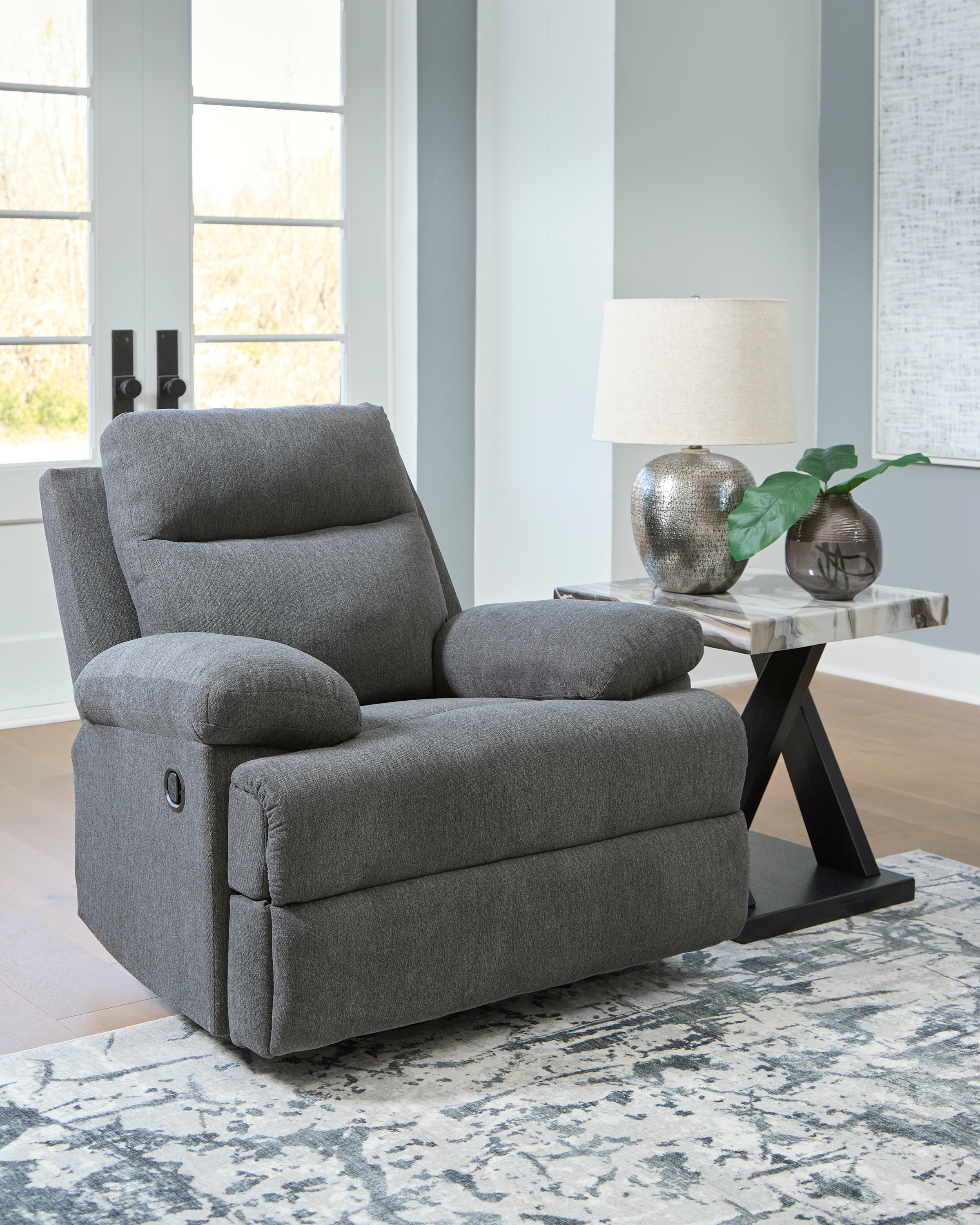 Fully upright or completely stretched out is how this traditional-inspired rocker recliner caters to the art of relaxation. Super soft charcoal-colored upholstery and sumptuous cushioning—made all the more indulgent with pillow top arms—cradles you in comfort from head to toe.