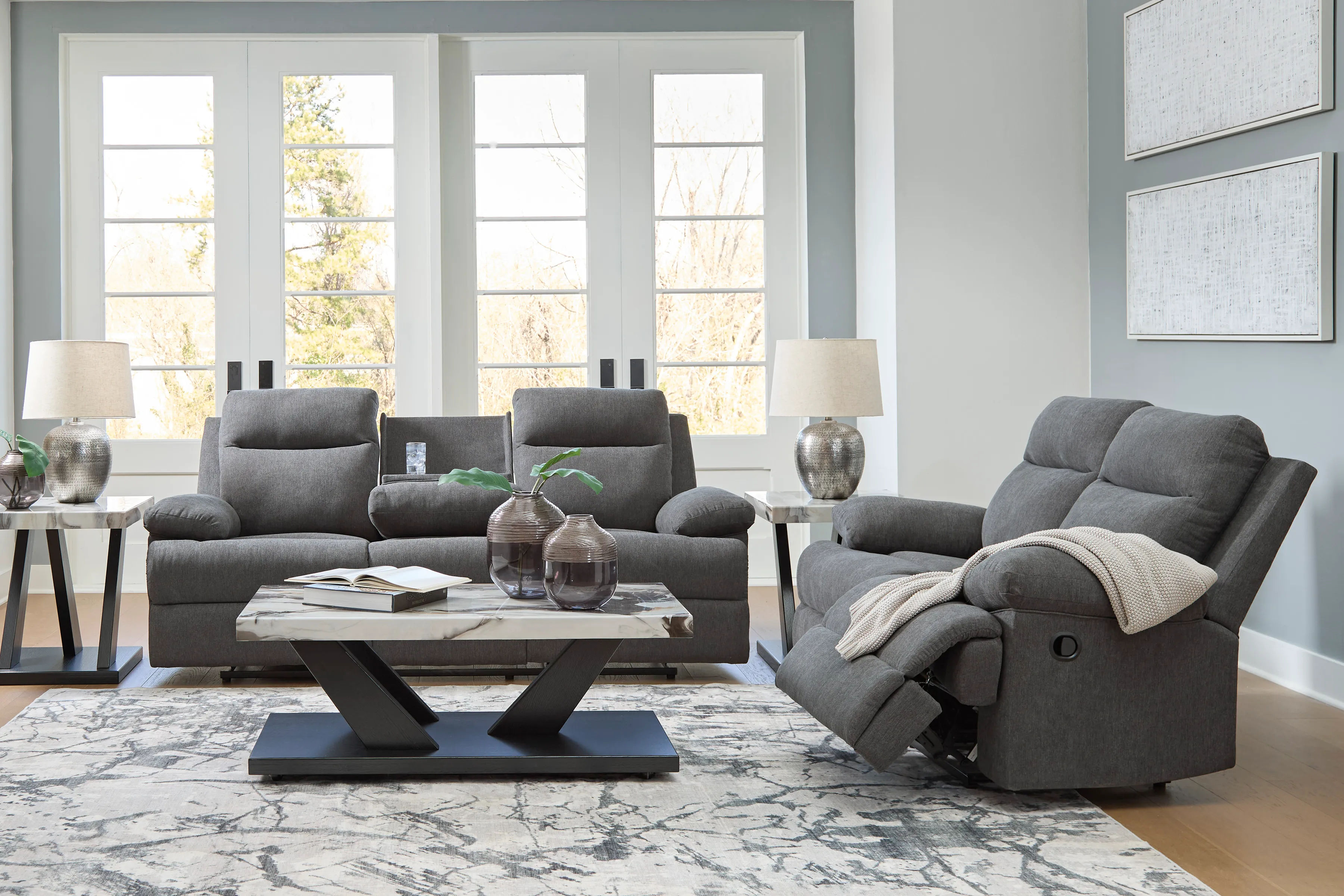 Fully upright or completely stretched out, this traditional-inspired reclining sofa caters to the art of relaxation. Super soft charcoal-colored upholstery and sumptuous cushioning—made all the more indulgent with pillow top arms—cradles you in comfort from head to toe. A middle seat with a drop-down table, cup holders and USB charging takes comfort and convenience to another level.