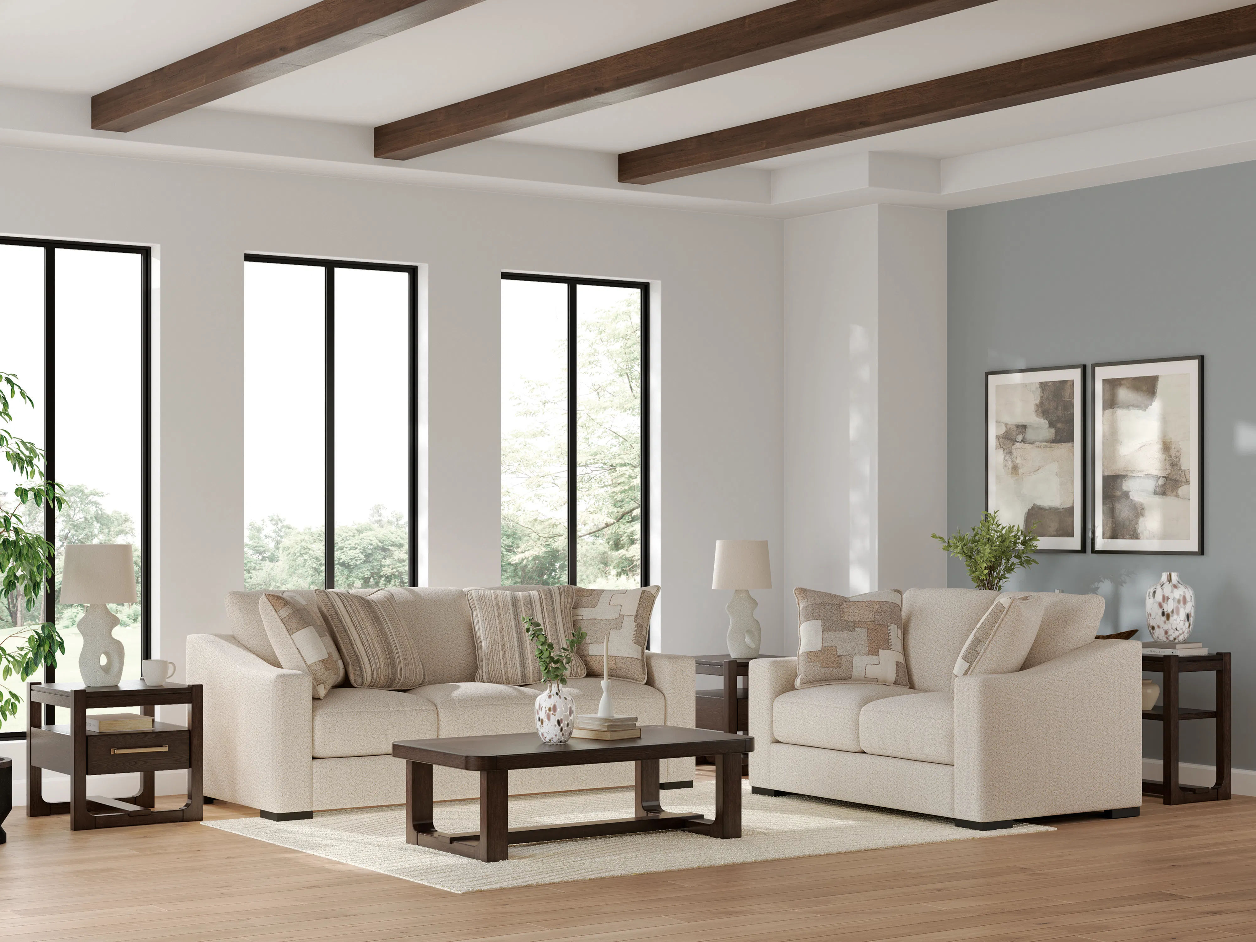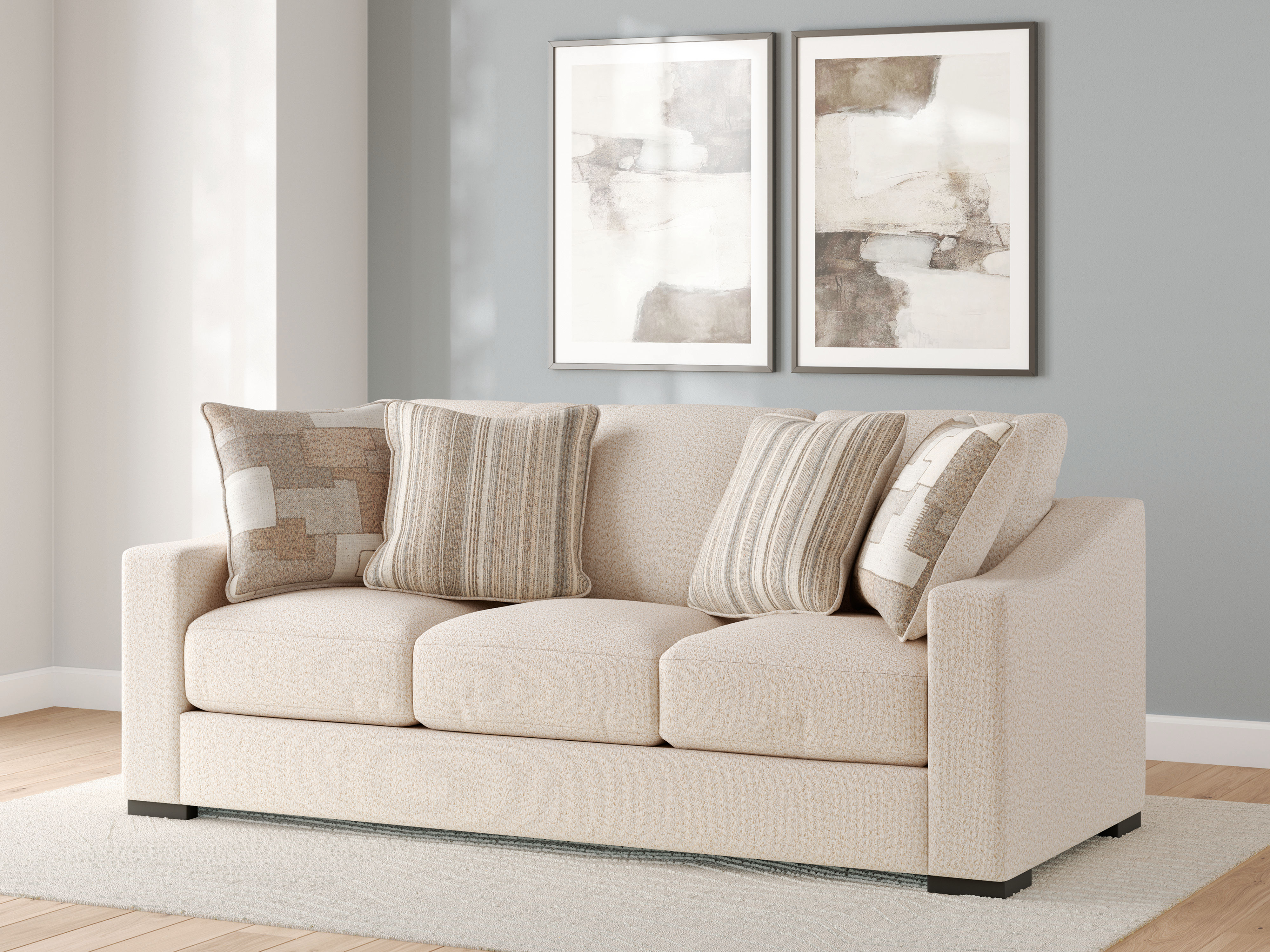 Strike the perfect balance of comfort and style. With this sofa, living room lounging gets a contemporary chic upgrade. Its sleek slope arms and soft neutral upholstery are so easy on the eyes. And when you’re sucked into your favorite book or streaming show, ultra-plush feather blend cushions keep you comfy as you relax.