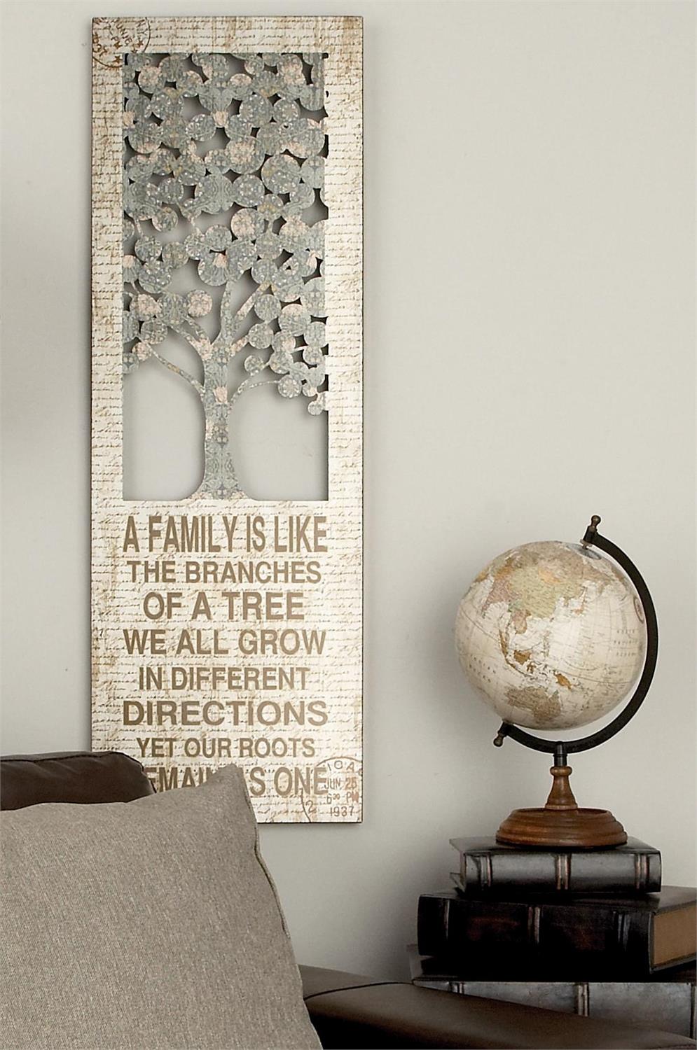 Infuse your home with cozy charm, where weathered textures, rustic finishes, and warm earthy tones create a wholesome atmosphere. Crafted from solid iron, this beige home wall decor boasts durability and longevity. Rectangle decor for wall is finished in matte beige and brown lettering, lending a rustic charm to its overall appearance. Iron wall decor features an intricately designed tree as the focal point, accompanied by an inspirational family quote and a unique postmark-printed panel.