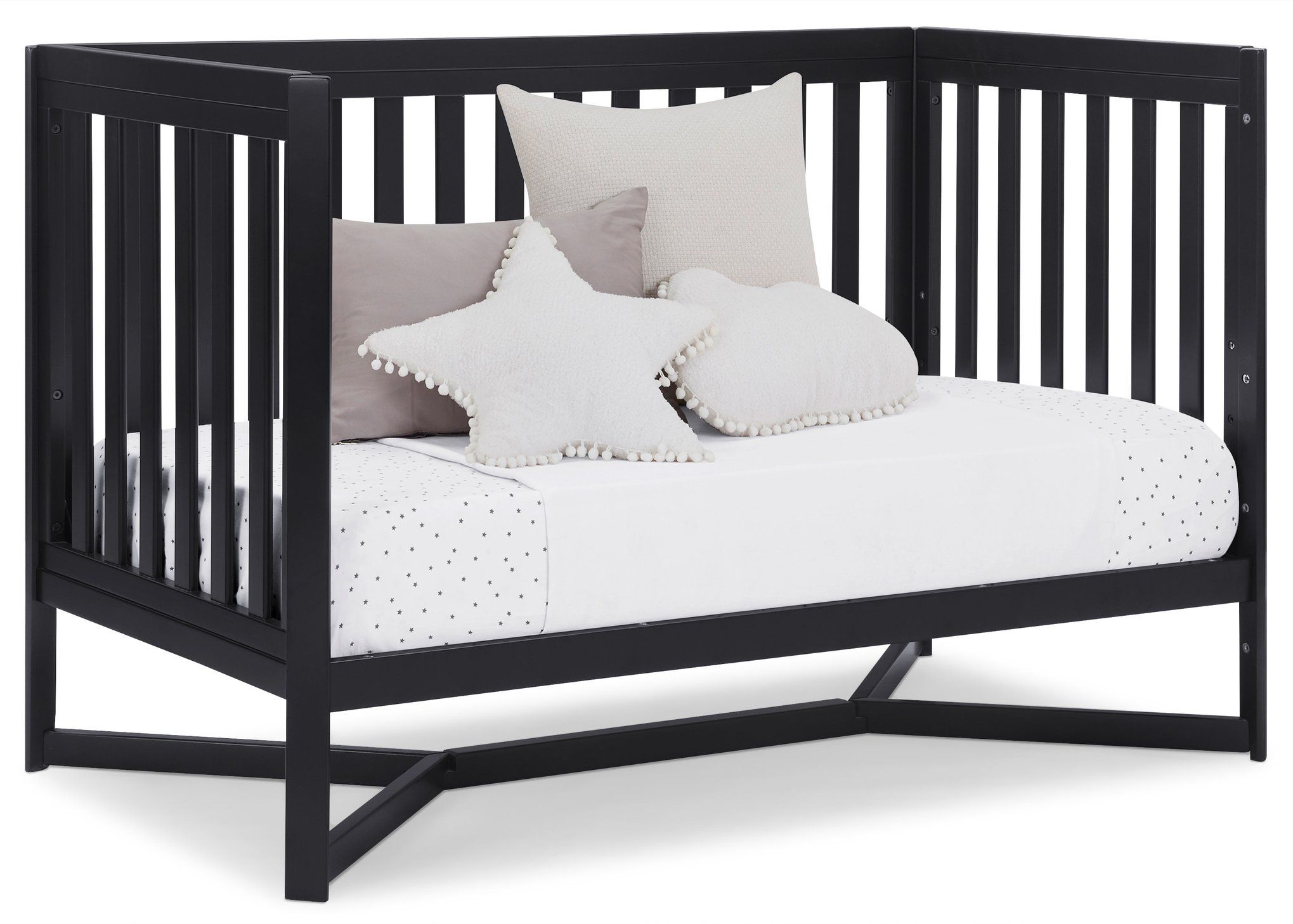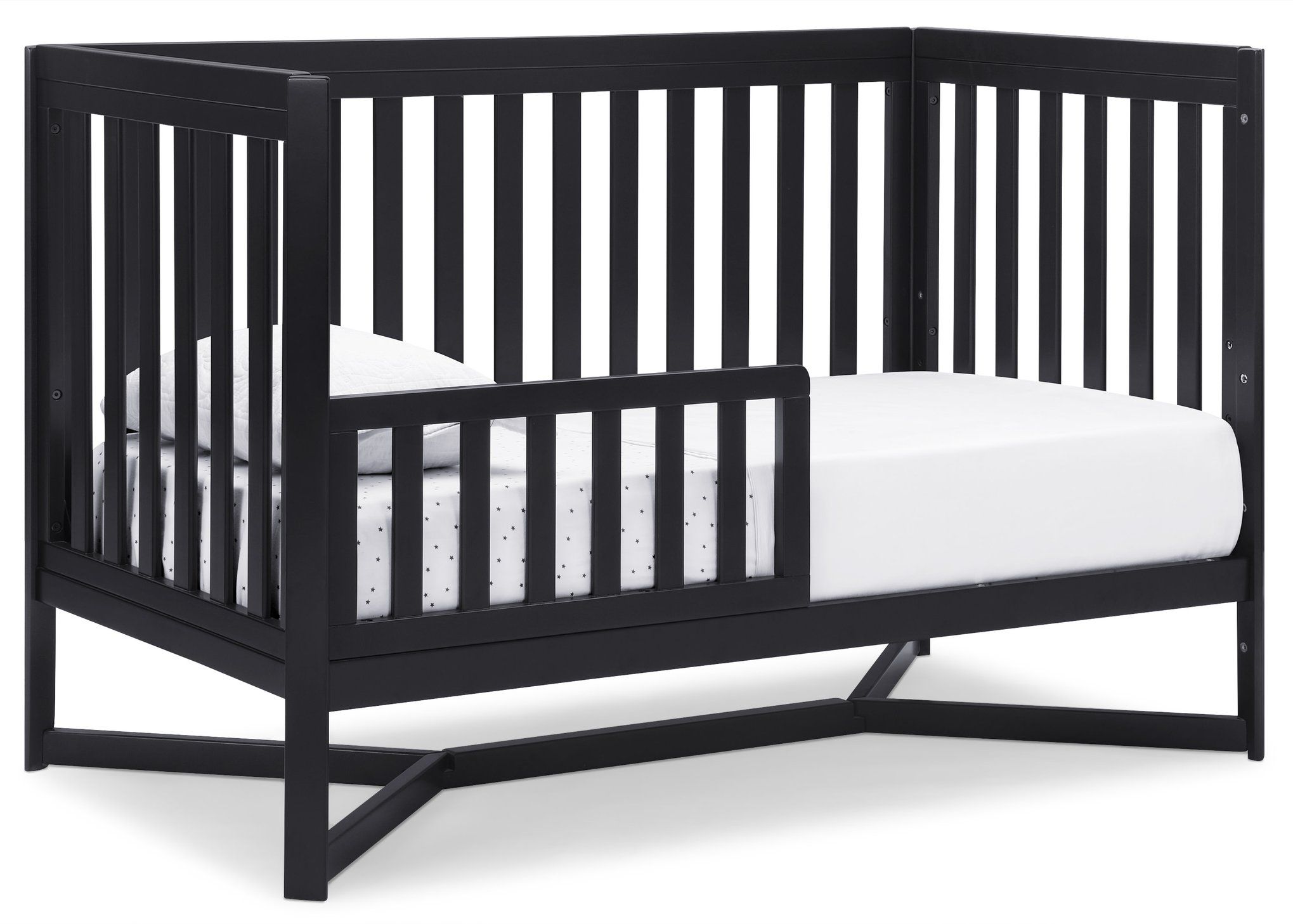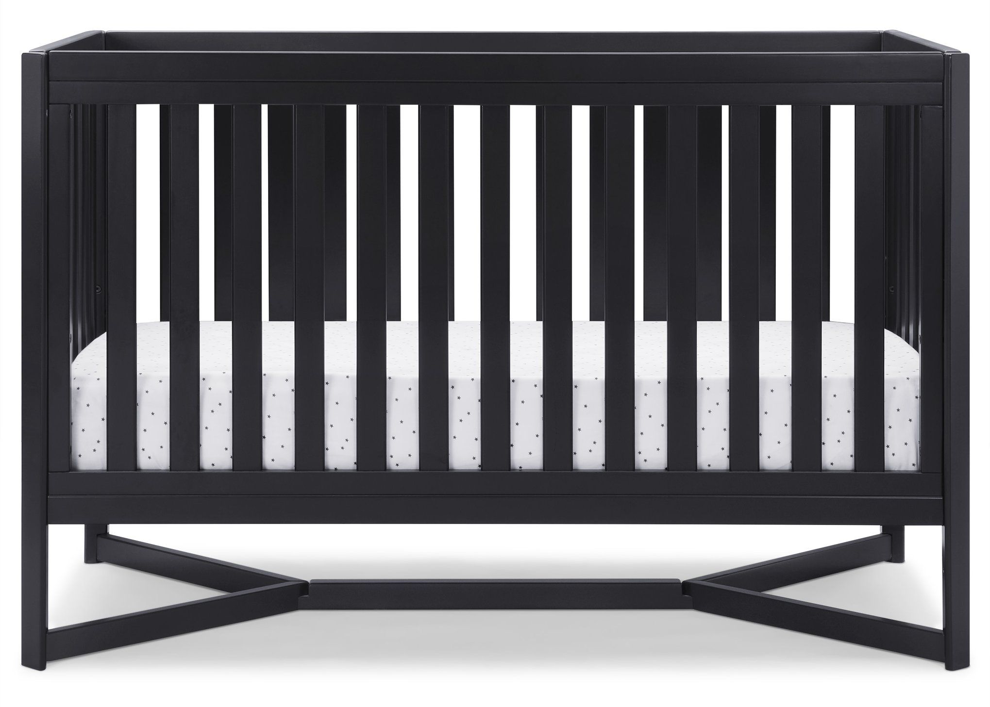Designed to be the centerpiece of your nursery, the Tribeca 4-in-1 Convertible Crib by Delta Children exudes contemporary cool. Featuring plenty of modern touches it boasts a sleek x-shaped base and airy slats. Crafted from strong and sturdy wood, this crib features three height levels, and converts to a toddler bed, daybed and full size bed, making it the only bed your baby will every need. Toddler Guardrail #0080, Full Size Wood Bed Rails #0050 or Full Size Metal Bed Frame #0040 sold separately.