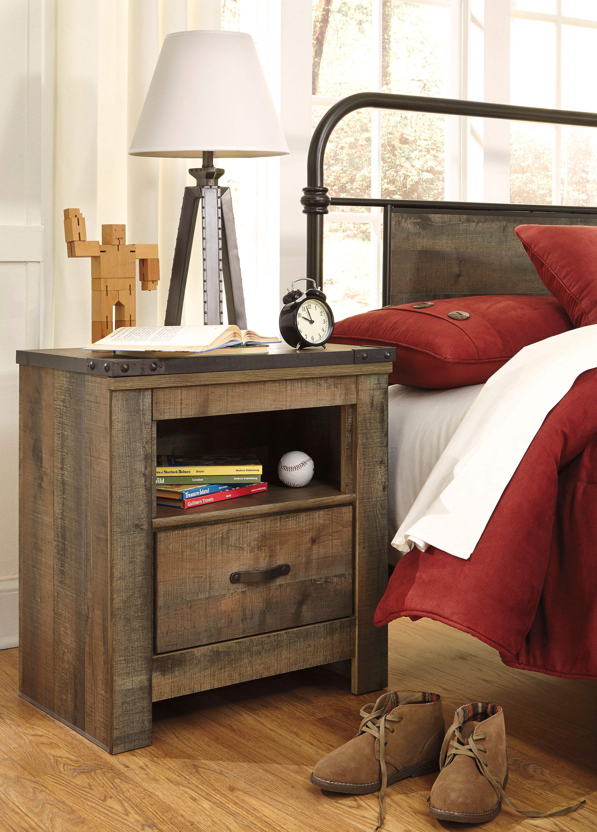 Whether she loves horses or he's a cowboy at heart, the Trinell nightstand matches their authenticity. Rustic finish, plank-style details and nailhead trim pay homage to reclaimed barn wood, making for a chic look loaded with charm. An included charging station for tablets, cellphones and other electronics offers an up-to-date convenience.