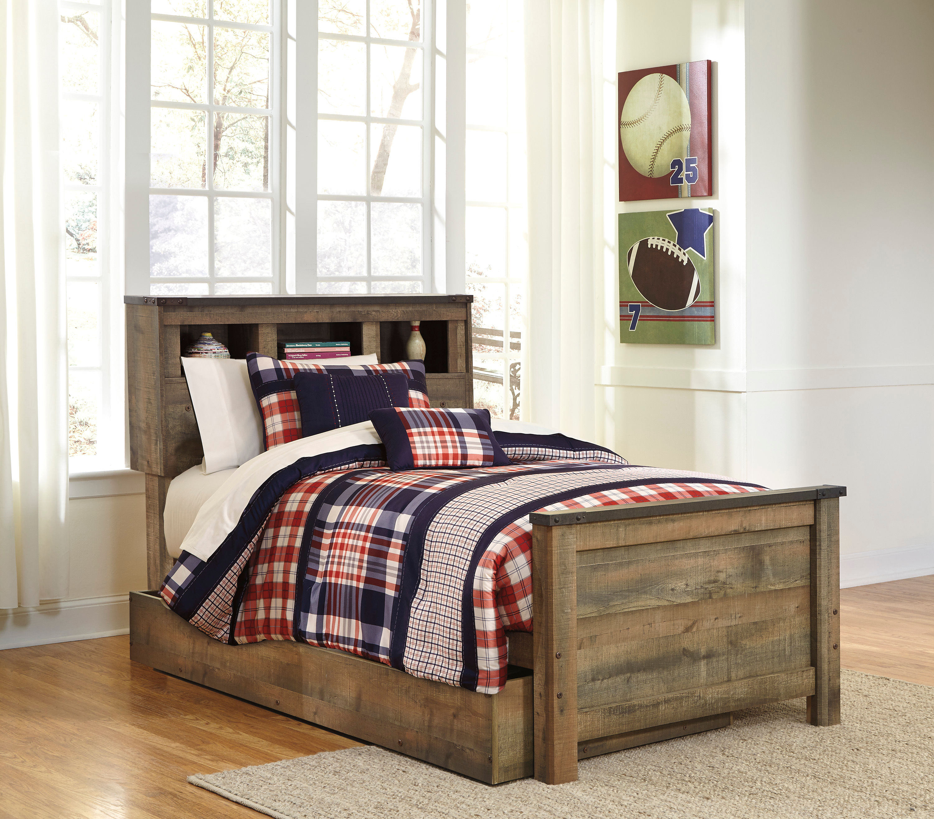 Whether she loves horses or he's a cowboy at heart, Trinell twin bookcase bed with under bed storage matches their authenticity. Rustic finish, plank-style details and nailhead trim pay homage to reclaimed barn wood, making for a chic look loaded with charm. Mattress available, sold separately.
