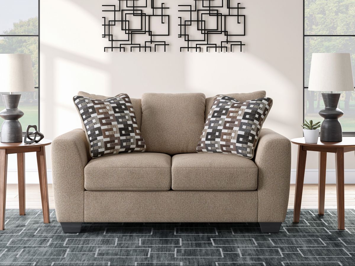 Transitional and right on trend. This loveseat's upholstery is a delightful change from the ordinary, with hints of soft brown giving the gray hue added depth. It’s punctuated with chic accent pillows in an eye-catching, stylized stripe design. Whether you're hosting friends and family or relaxing solo, this loveseat invites homey, comfortable character into your space.