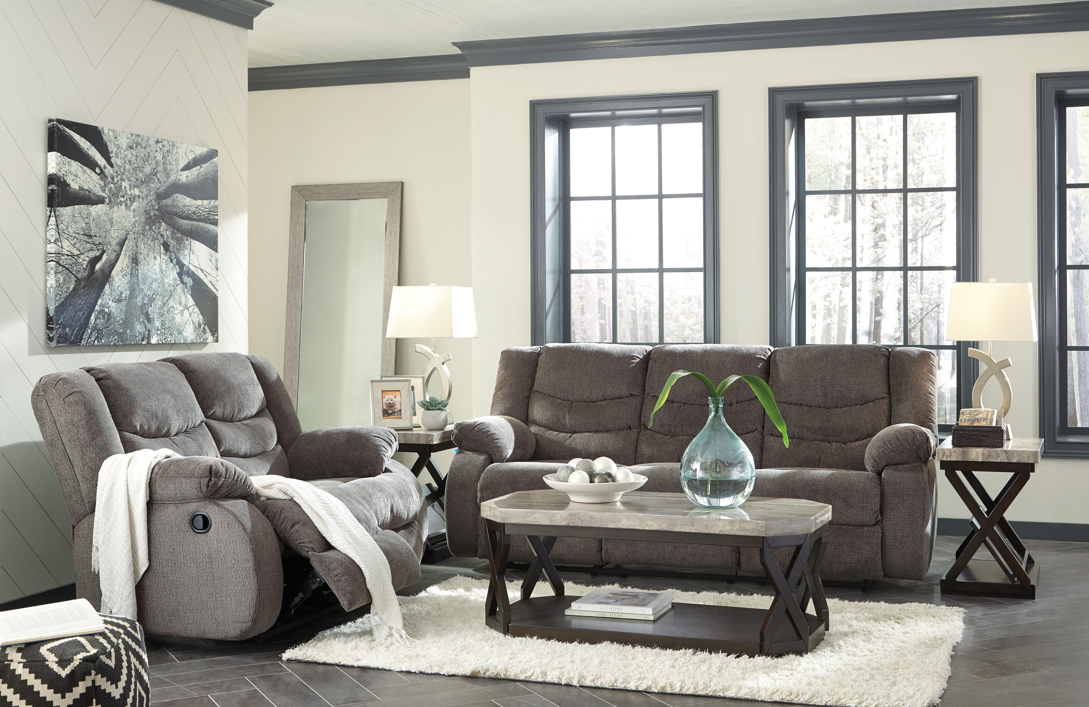 The Tulen reclining sofa and loveseat set puts the win in winning. Its waterfall back design and doubly plump pillow top arms team up with soft chenille fabric to go for the goal. Ample seating room makes the comfort possibilities endless. Sit back and relax. You won’t go wrong with this reclining set.