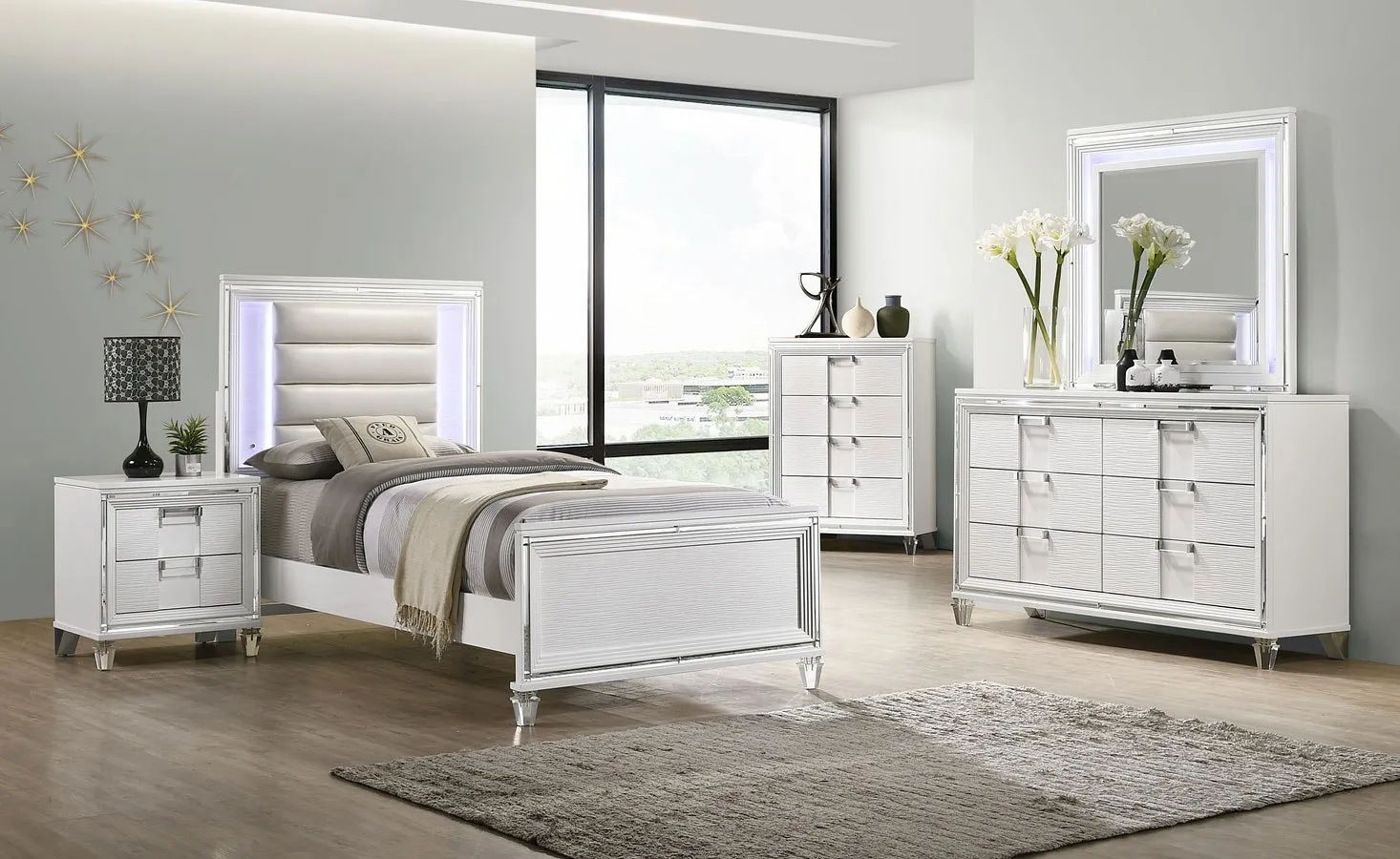Stealing the show with its glamorous good looks and upscale attitude, the Twenty Nine Dresser and mirror set will bring some glamour and modern vibes to your bedroom. With clear handles and the first two legs are clear, this dresser will turn heads.
