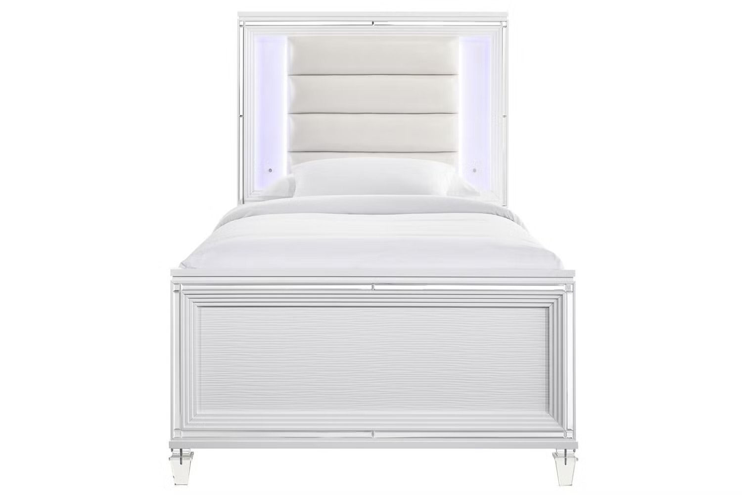Reminiscent of Hollywood glamour of yesteryear, the Twenty Nine twin size panel bed interprets luxury in a decidedly modern way. It's made with a white wooden frame and a white cushion on the headboard made of faux leather. This bed also includes LED lights that add more style to this design.