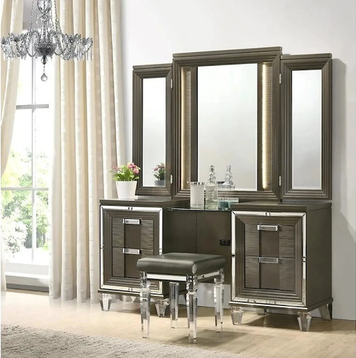 A dazzling glam style for modern bedrooms, the Twenty Nine vanity set has a contemporary design.