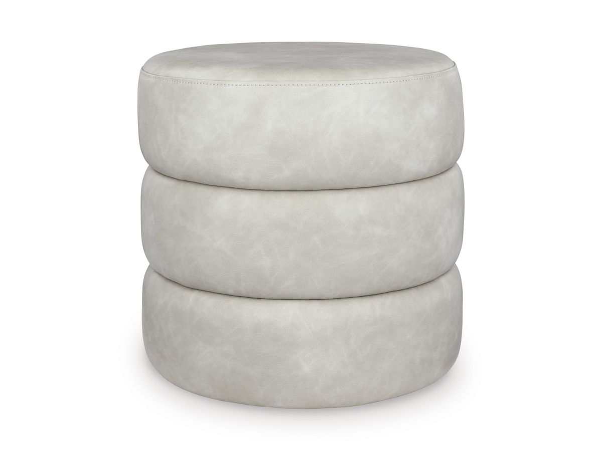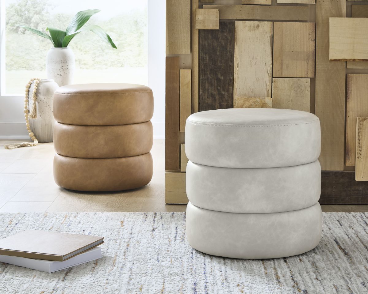 Flair and function are packed into one small package with this accent ottoman. Faux leather upholstery lends a casually cool vibe, while a swivel base puts a twist on everyday comfort. It works great as a footrest or spare seat when hosting guests. Short on surface space? This piece can function as an ultra-chic accent table in a pinch, supporting remotes and other accessories in style.