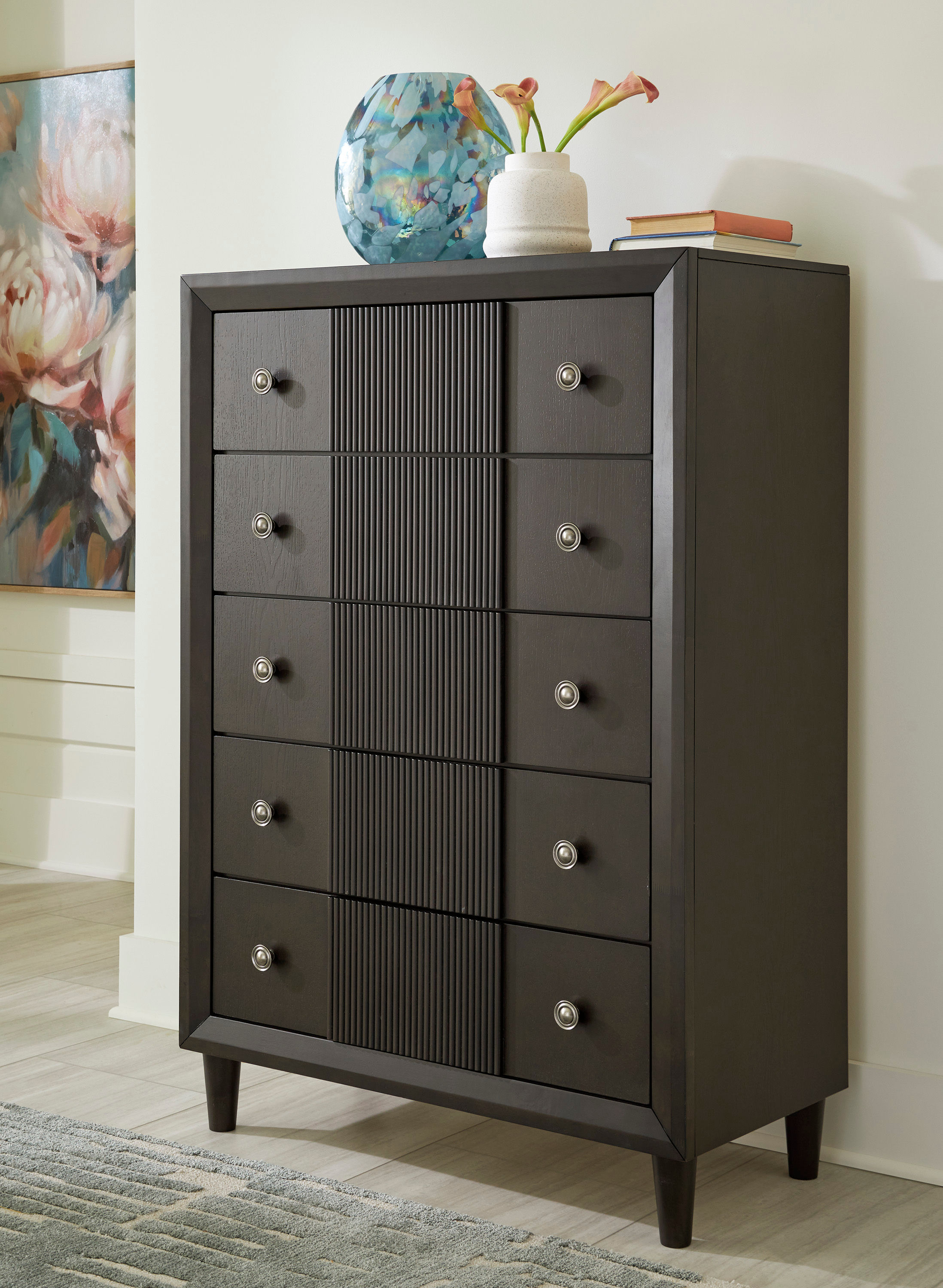 Master the art of metropolitan living. Crafted with posh practicality in mind, the Urbantrack chest of drawers stores everyday essentials in striking fashion. A chic reeded accent delivers effortless textural interest. Adding this piece to your existing collection? The warm dark brown hue welcomes a variety of style pairings, from casual to urban contemporary.