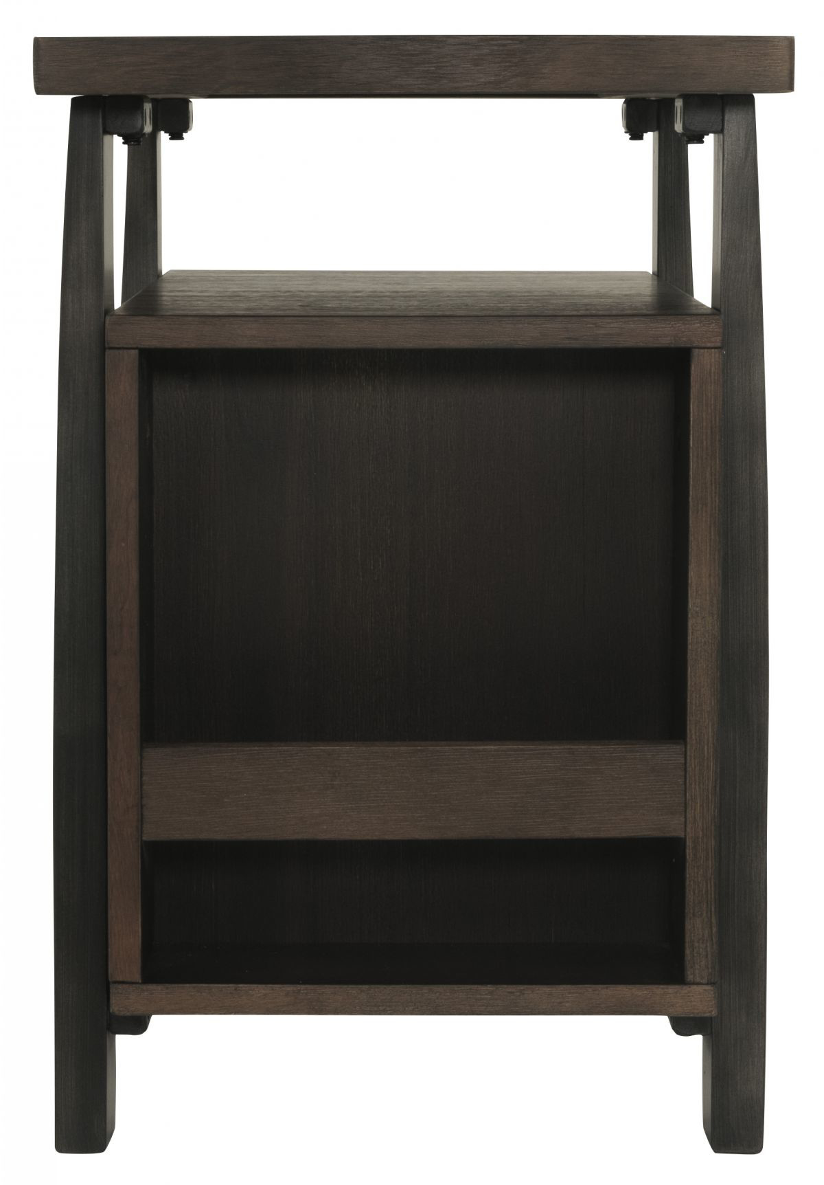 Form, function and a whole lot of style is what the Valibry chairside end table is all about. Its deep cabinet, open upper shelf and top offer lots of convenient spots to keep chairside necessities. The distressed brown finish contrasts beautifully with the dark brown faux metal finished legs for a floating top look that's striking. The magazine rack on the back of the table is an added bonus for keeping periodicals within reach, but out of sight—quite a value for a look that will withstand the test of time.