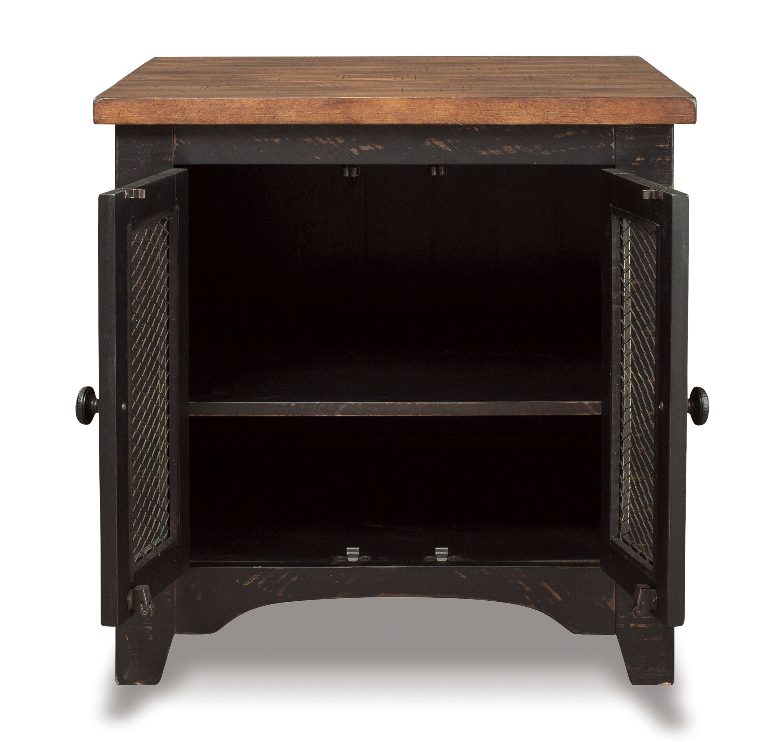 To those with an eye for the best in rustic farmhouse living, the two-tone Valebeck end table doubles up on charm. Designer touches include plank-effect styling, distress marks and wire mesh door fronts for added character.