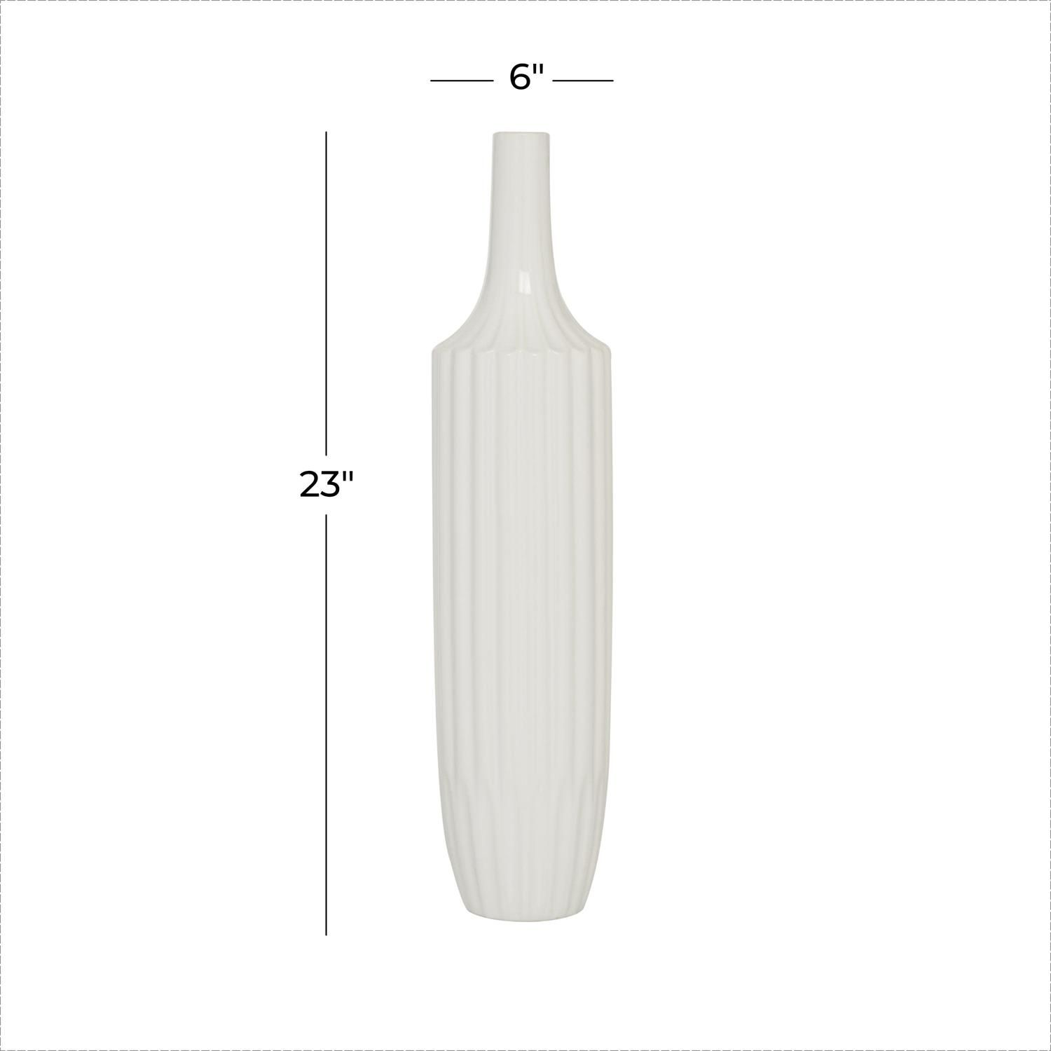 Inspired by sleek elegance and clean lines, a minimalistic design offers effortless luxury with monochromatic tones and bold, angular structures. This white decorative vase is crafted from high-quality ceramic material. The round home decor vase boasts a white color with a polished ceramic finish. This stoneware vase features a unique stripe texture design.