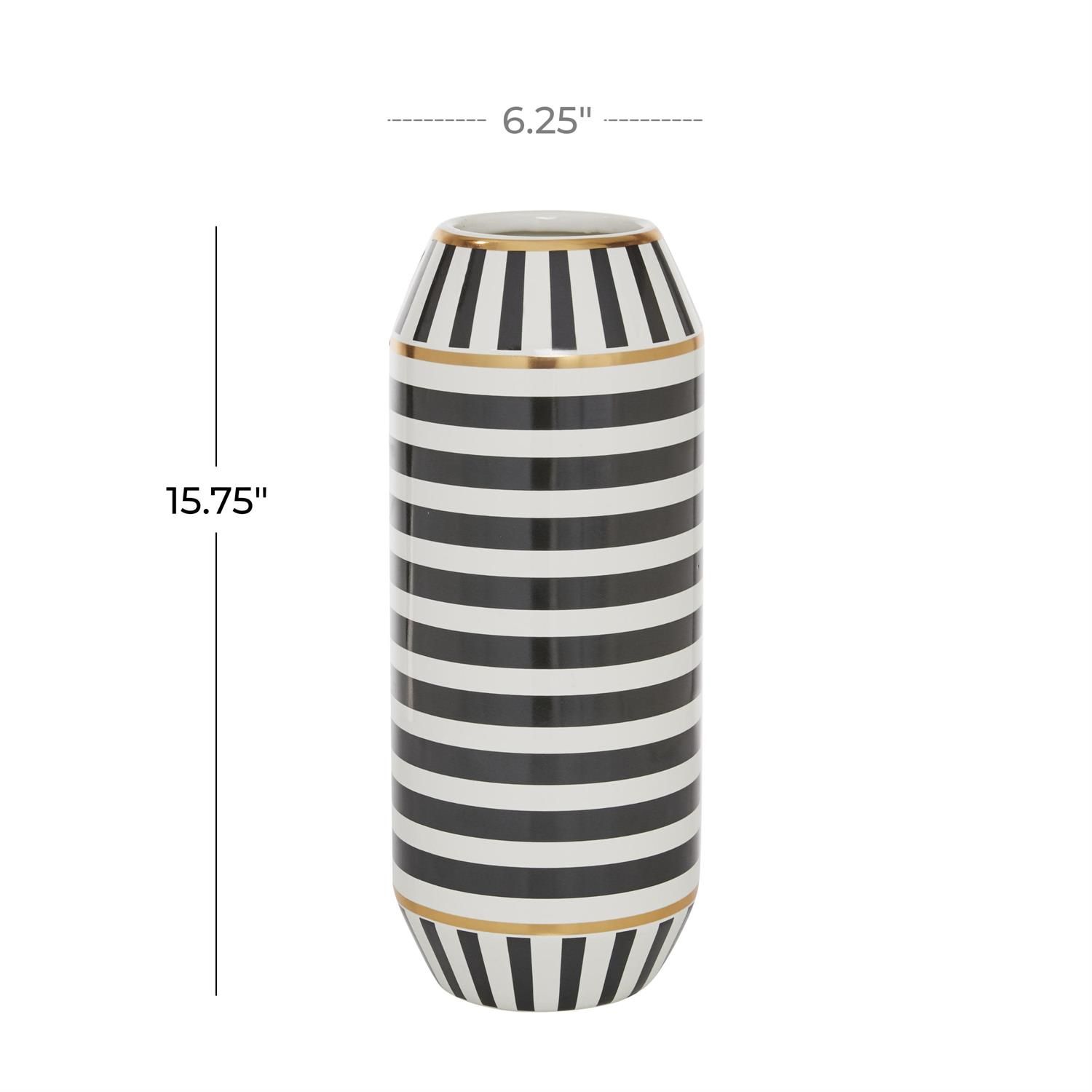 Inspired by sleek elegance and clean lines, a minimalistic design offers effortless luxury with monochromatic tones and bold, angular structures. Made from high-quality ceramic, the black decorative vase exudes sophistication. The round home decor vase features a black and white color with a polished finish and elegant gold accents. This ceramic vase boasts intricate striped patterns for added sophistication.