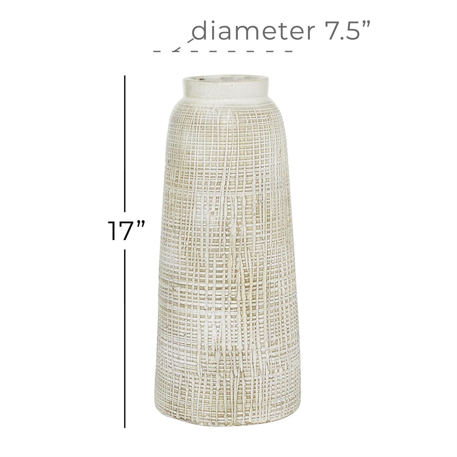 Inspired by blissful serenity and the allure of the sea, where soothing hues and natural textures bring effortless charm to the home. This white decorative vase is made of solid ceramic for unique aesthetic and durability. Cone home decor vase features a distressed white finish with shades of brown. This ceramic vase features crosshatching details that will add style to any setting.