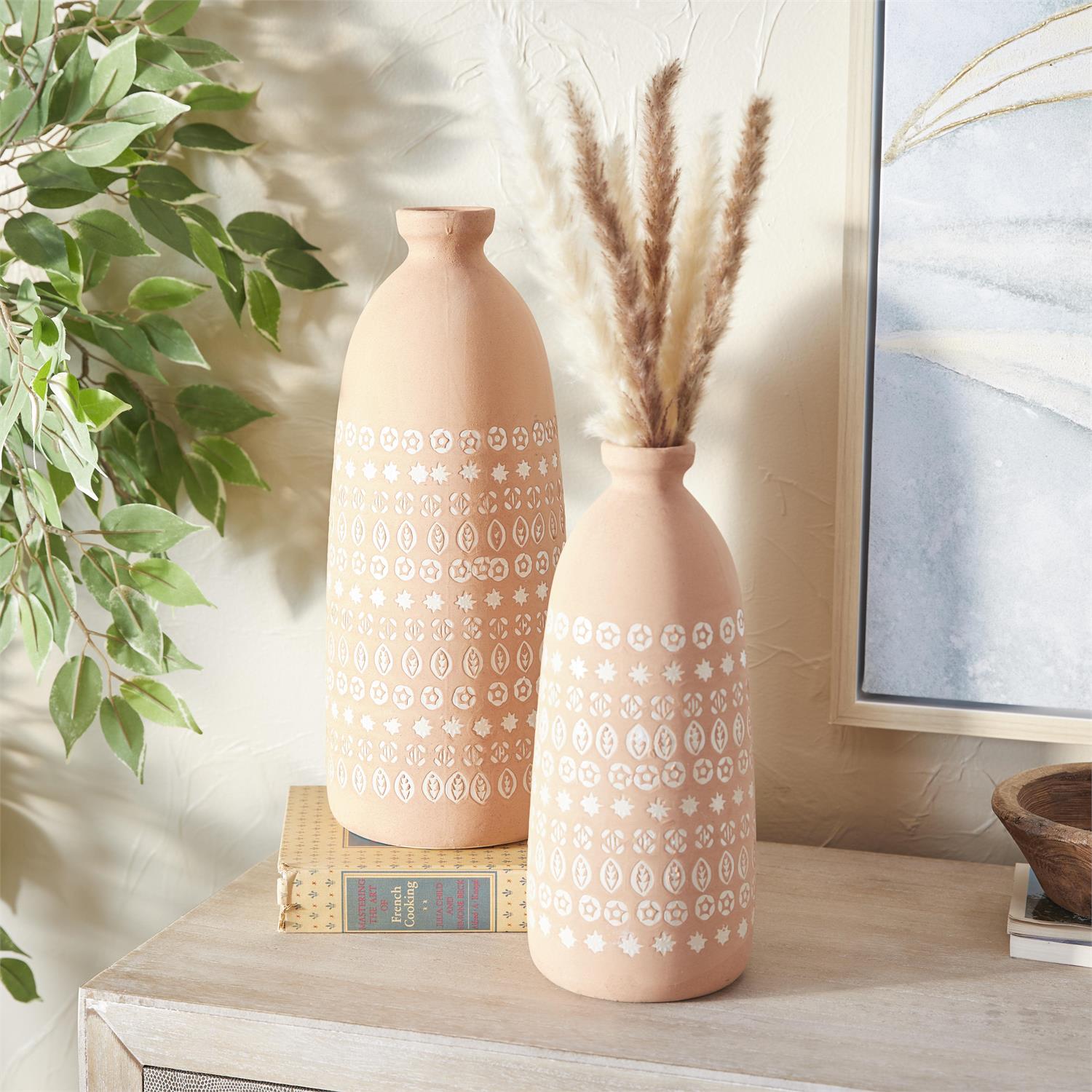 Add elegance to your home with this pink vase set of two, featuring earthy charm.