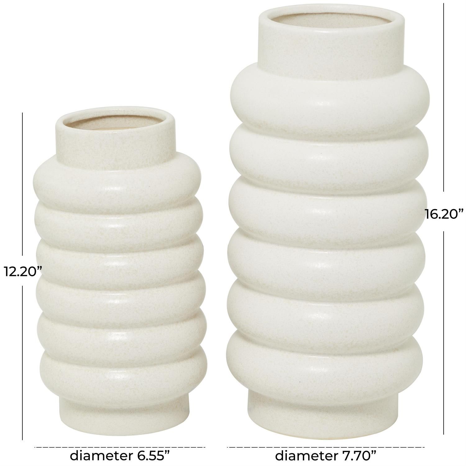 Inspired by sleek elegance and clean lines, a minimalistic design offers effortless luxury with monochromatic tones and bold, angular structures. The white decorative vase set is crafted from stoneware, ensuring durability and longevity. The round home decor vases set carries a polished white ceramic finish, adding a touch of sophistication to any room. This stoneware set of 2 vases features stacked bubble rings that adds texture and visual interest.