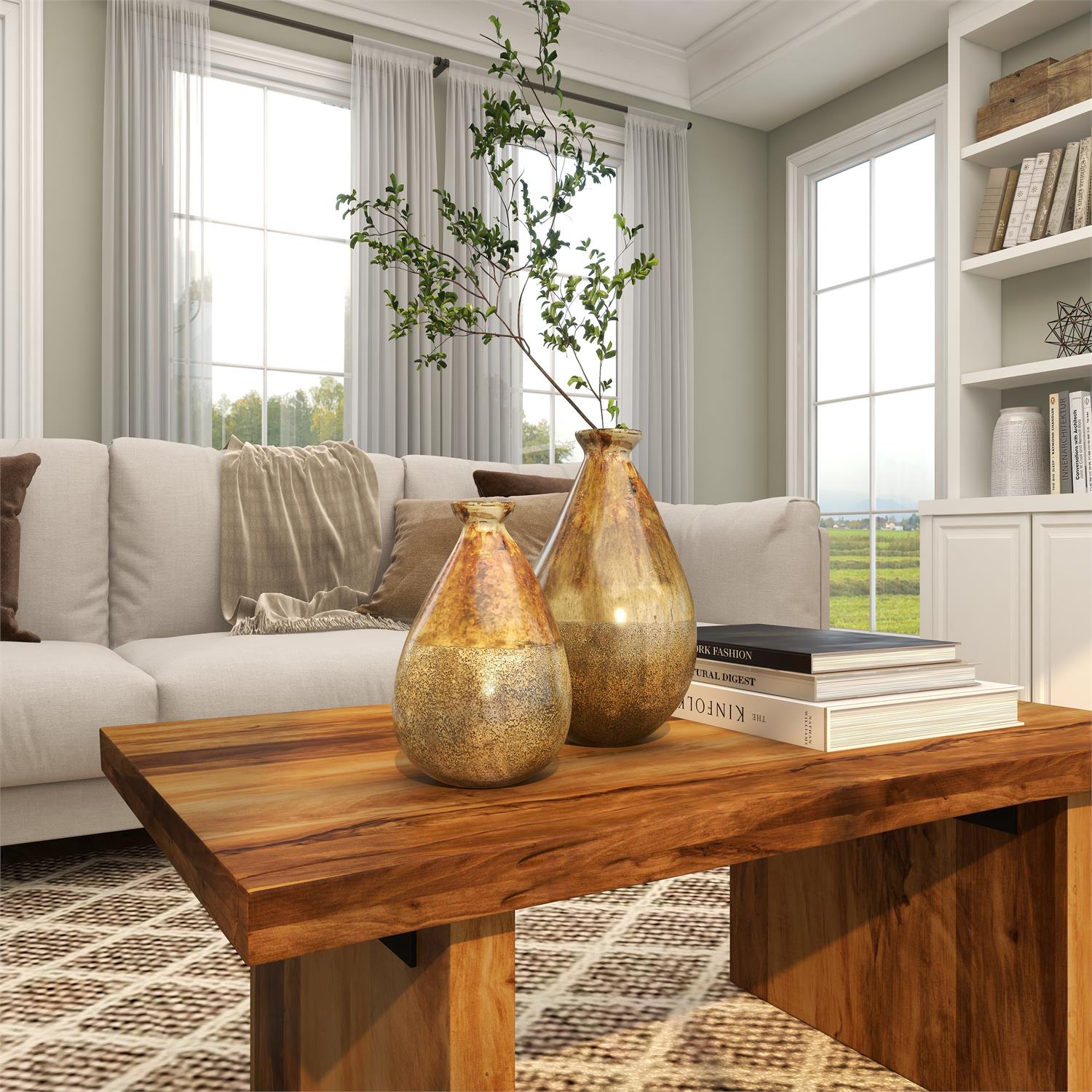 Designed with rugged beauty and an earthy charm, where natural simplicity, warmth, and organic materials create a wholesome atmosphere. Made from high-quality solid glass material, this gold decorative vase set is sure to elevate your home. This round home decor vases set highlights a polished gold and mottled taupe ombre finish, enhancing its round home decor vases set appeal. Featuring erratic teardrop forms with slightly flared lips, the glass set of 2 vases offers unique and eye-catching details.