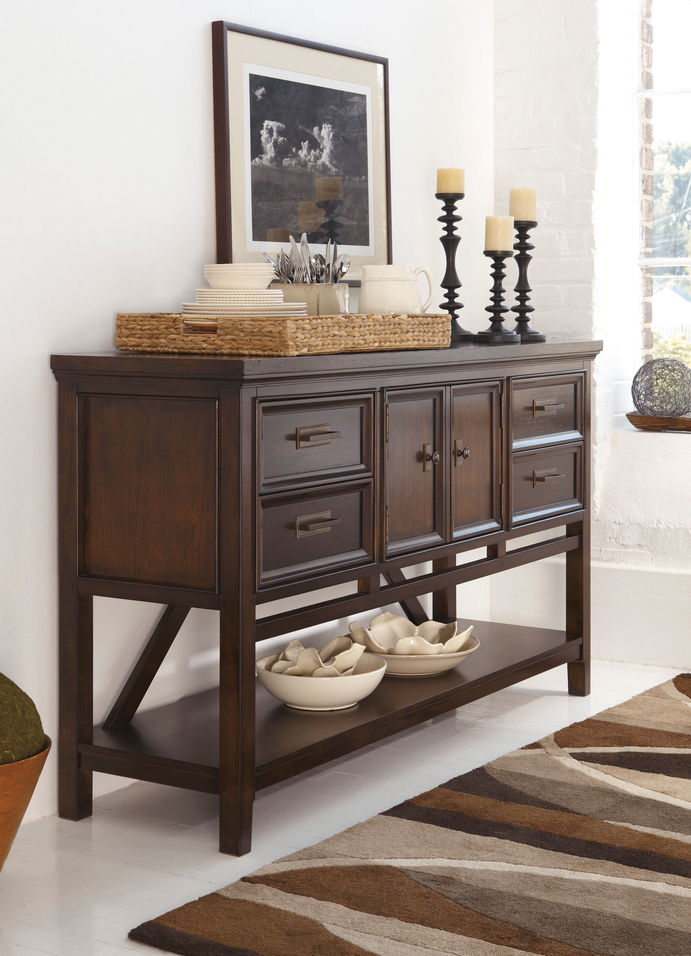For those who appreciate a traditional aesthetic with understated elegance, the Veramond dining server brings home a feast for the senses. Its rich brown walnut finish merges seamlessly with a profiled top and baluster turned legs for a richly classic appeal. Thanks to its versatile functionality, this piece effortlessly works as a sideboard, TV stand or entryway table. What a deliciously timeless choice.