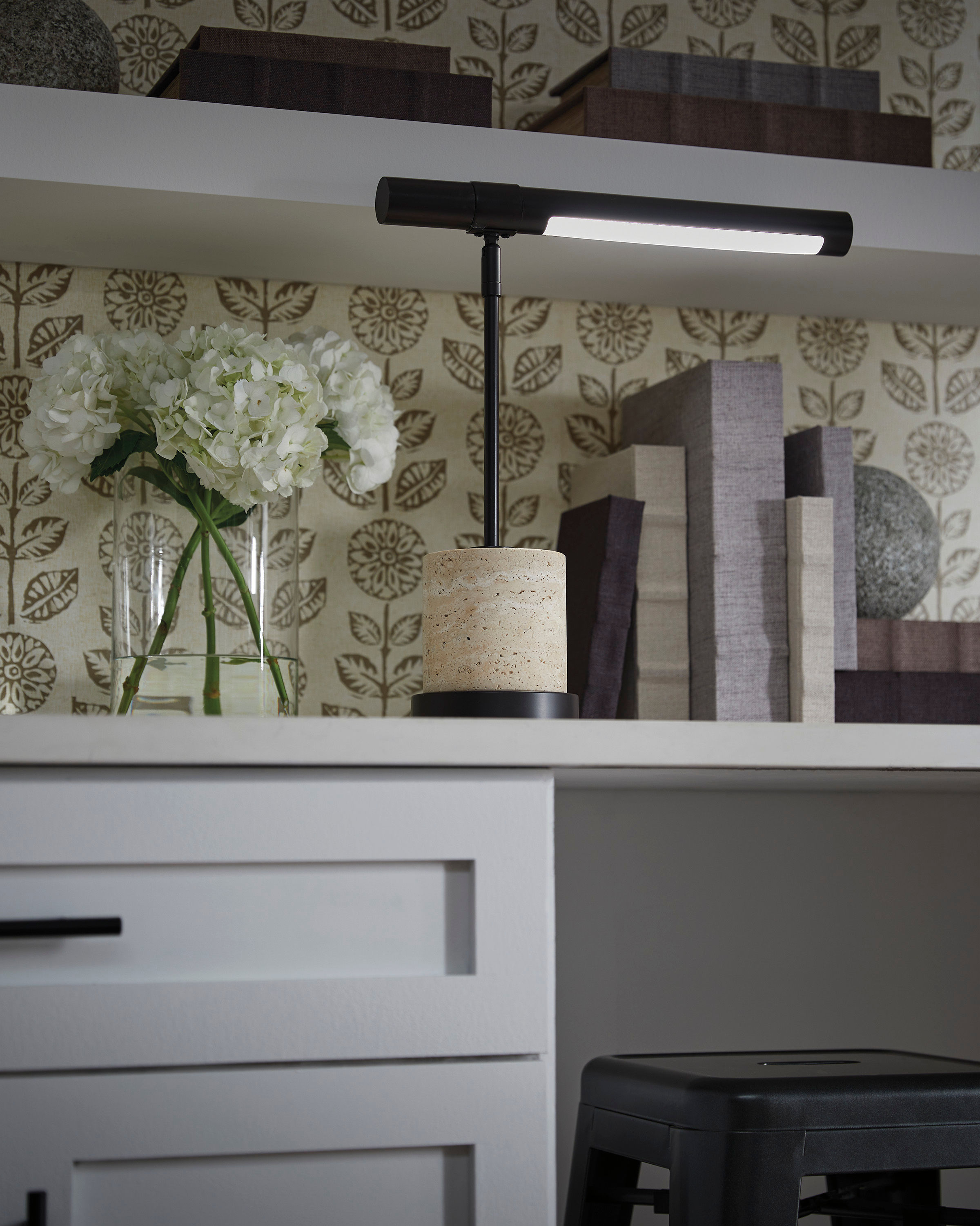 Love clean lines and sleek styling? Then this desk lamp is sure to find a place in your heart. Its architectural lines and beige travertine base are stunning in their chic simplicity. And USB-C charging in the base allows you to keep devices nearby while you study or work from home.