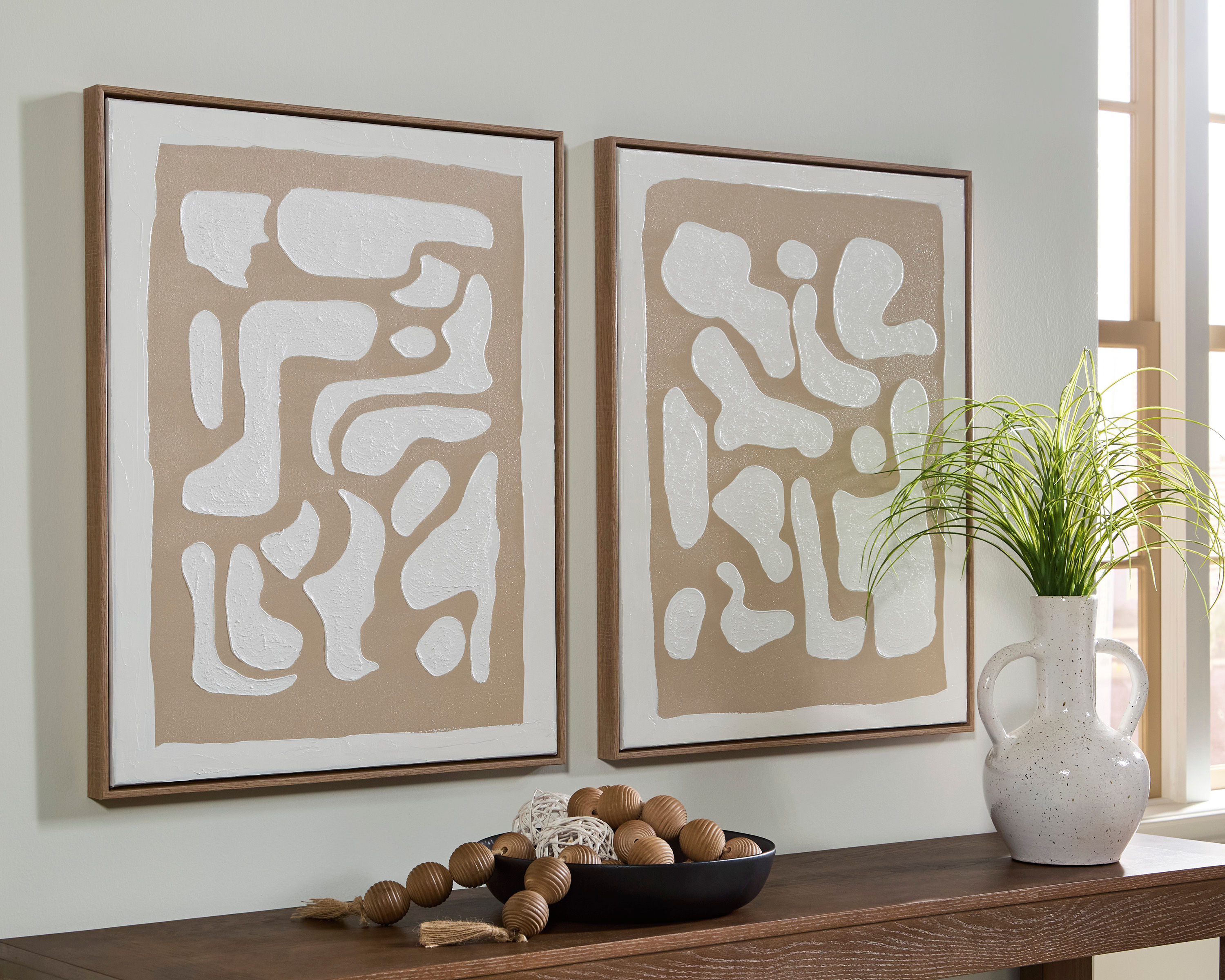 The abstract shapes and neutral hues of this wall art set are a reflection of your modern taste. Hand painting highlights the attention to craftsmanship, with light brown frames elegantly completing the duo. And each piece hangs four ways, giving you the flexibility to switch up their staging.
