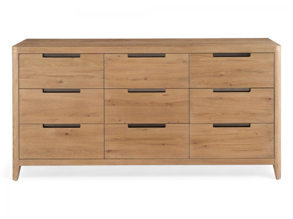 The Walker Drawer Dresser boasts nine drawers and is finished in an organic Natural Oak, offering a versatile and dynamic piece that's as functional as it is aesthetically pleasing. Its natural finish highlights the inherent beauty of the wood, making this dresser a timeless addition to any bedroom seeking a blend of practicality and natural elegance.