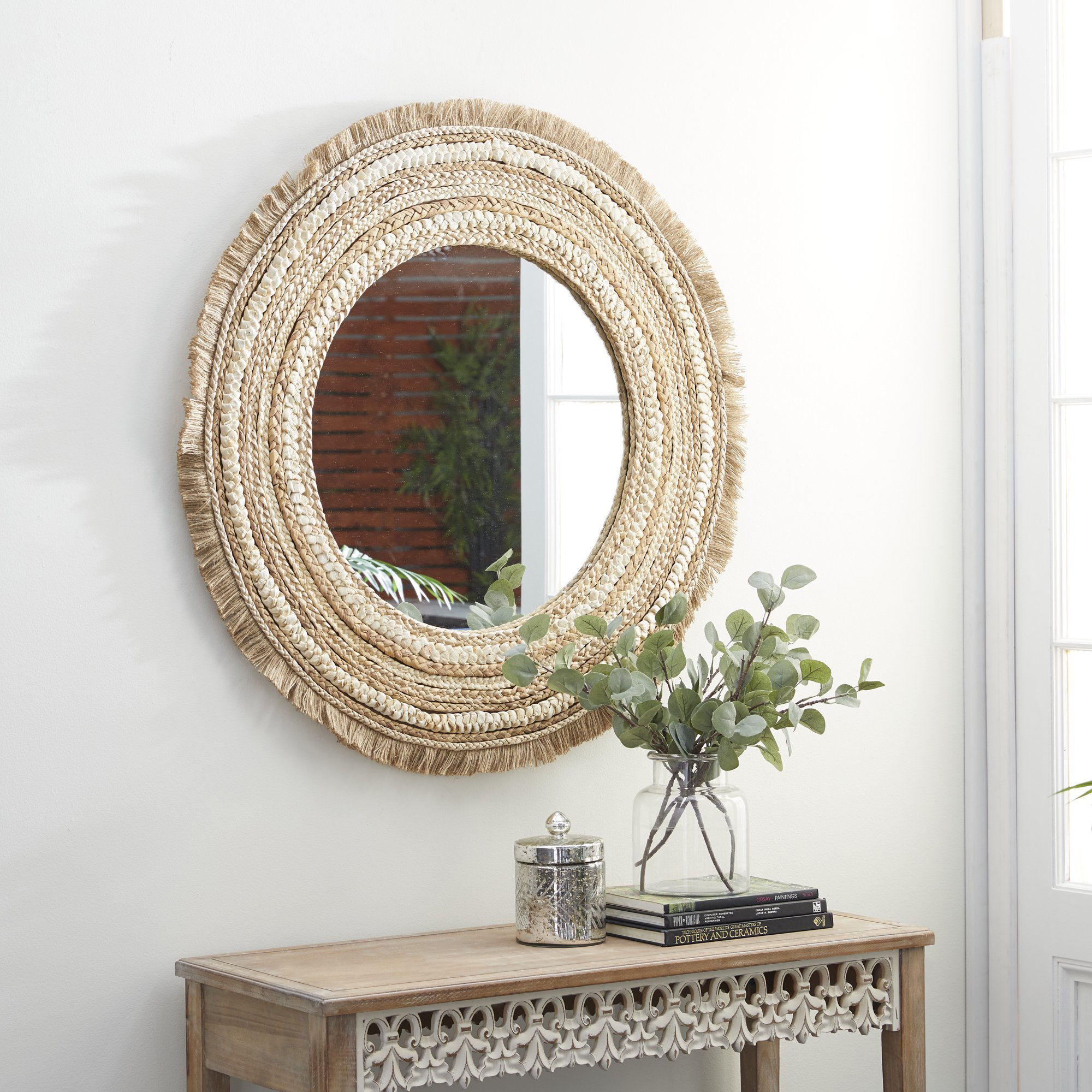Infuse your living space with boho chic vibes using this round accent mirror adorned with a frame in earthy tones of brown, tan, and beige. Handcrafted with care, its eclectic design adds warmth and texture to any room, reflecting your unique style effortlessly.