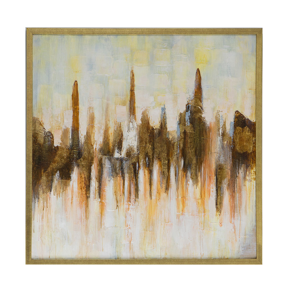 Enjoy the abstract design on this eye-catching piece of Wall Art, made with a contemporary style. The goldtone frame and the mostly yellow color scheme with a hint of blue at the top will be sure to be a conversation starter.