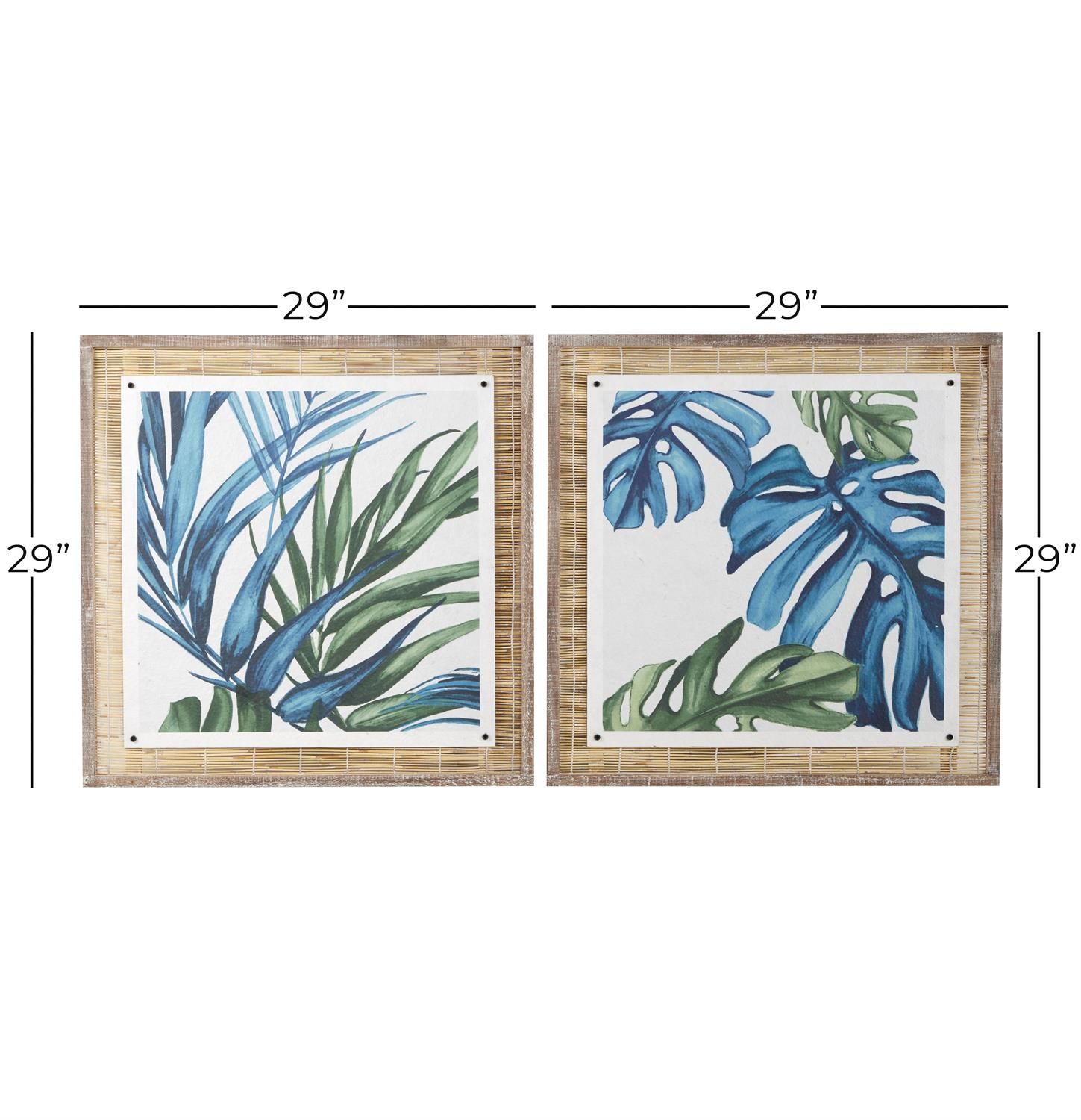 Designed with a free-spirited charm where vibrant hues, eye-catching patterns, and whimsical accents transform your space and showcase your personality. This blue home wall decor set is crafted from reed plant material, fir wood, paper, and MDF. This square decor for walls features leaf paintings that come in a textured finish with blue, white, and green colors in a distressed brown frame. This dried plant material set of 2 wall decors feature a reed frame enclosing the leaf paintings, creating a unique textured look.