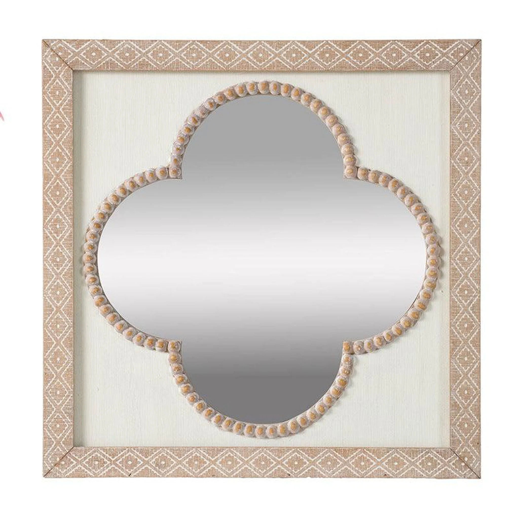 Traditional styling meets bohemian style with the accent wall mirorr. Made with a neutral color palette, this accent wall mirror will blend in perfectly with your already existing decor. The pattern on the frame and the beading around the shape of the mirror itself will be sure to catch your guest's attention and add visual interest to any room.