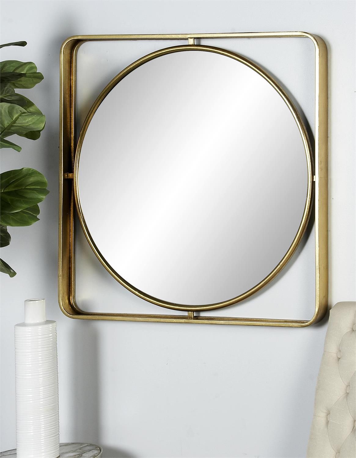 Embrace artistic expression with a style that highlights bold designs with sleek lines, neutral elements, and a minimalist aesthetic. Constructed from sturdy iron and quality glass with an MDF backing, this gold room wall mirror is both durable and stylish. The round hanging wall mirror boasts a polished gold finish, for a stylish appeal. This metal wall mirror offers a rounded surface and an outer square frame that adds depth and light, enhancing any space it adorns.
