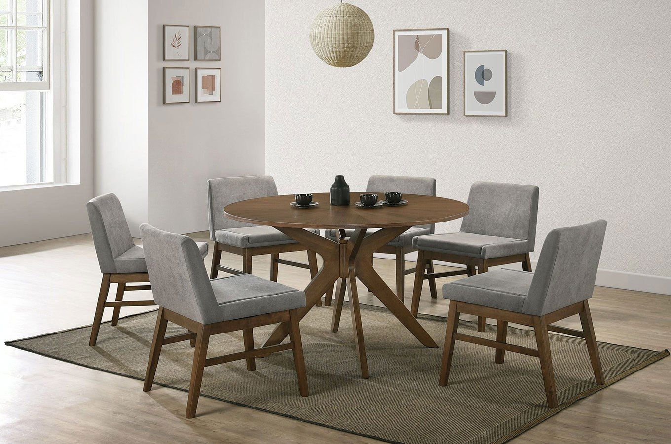 The Weston dining room set includes a round dining table and 6 dining chairs. The dining room table will be big enough to fit your friends and family, the upholstered dining chairs have a light gray upholstery with dark brown wooden legs.