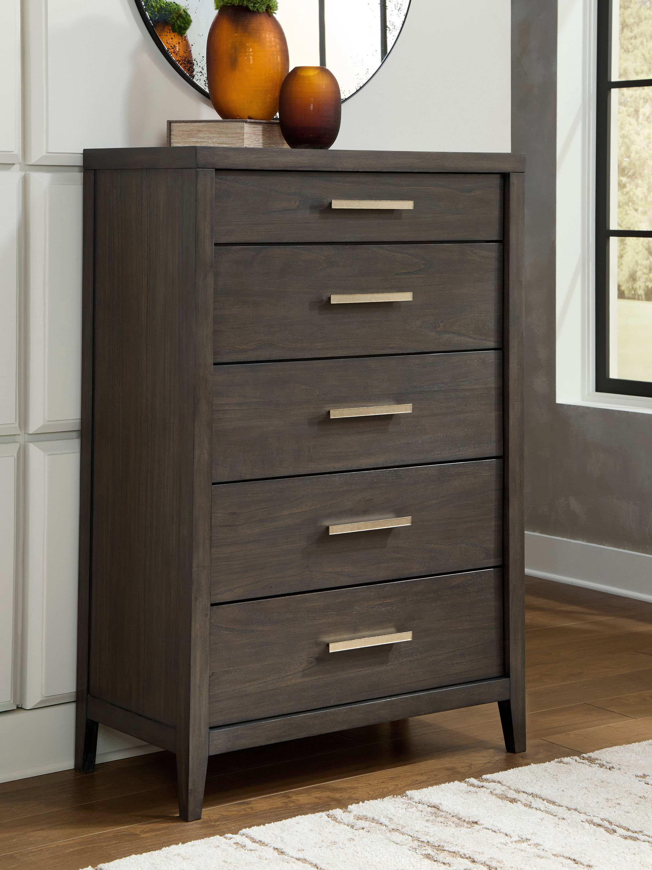Create your ideal sanctuary with the Westonfort chest of drawers. The dark espresso brown finish and clean lines are undeniably contemporary, but the attitude is more relaxed—our interpretation of metropolitan casual style. An off-the-floor design with tapered legs beautifully elevates the mood. Spacious drawers with ridged metal bar pulls keep essentials organized. Whether you're starting your day or winding down, this stylish piece provides the perfect backdrop.