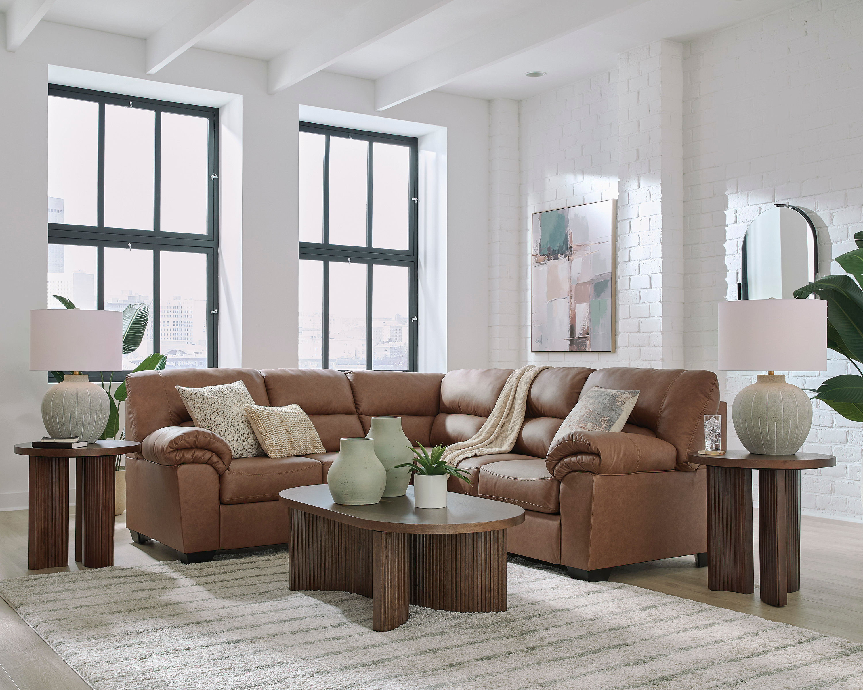 Modern comfort never looked so good. Sporting supremely soft yet durable cushions accented with high-fashion jumbo stitching, this stunning sectional is the ultimate choice in comfortably cool, contemporary style. Its caramel-hued faux leather indulges with an upscale feel and wows like the real thing.