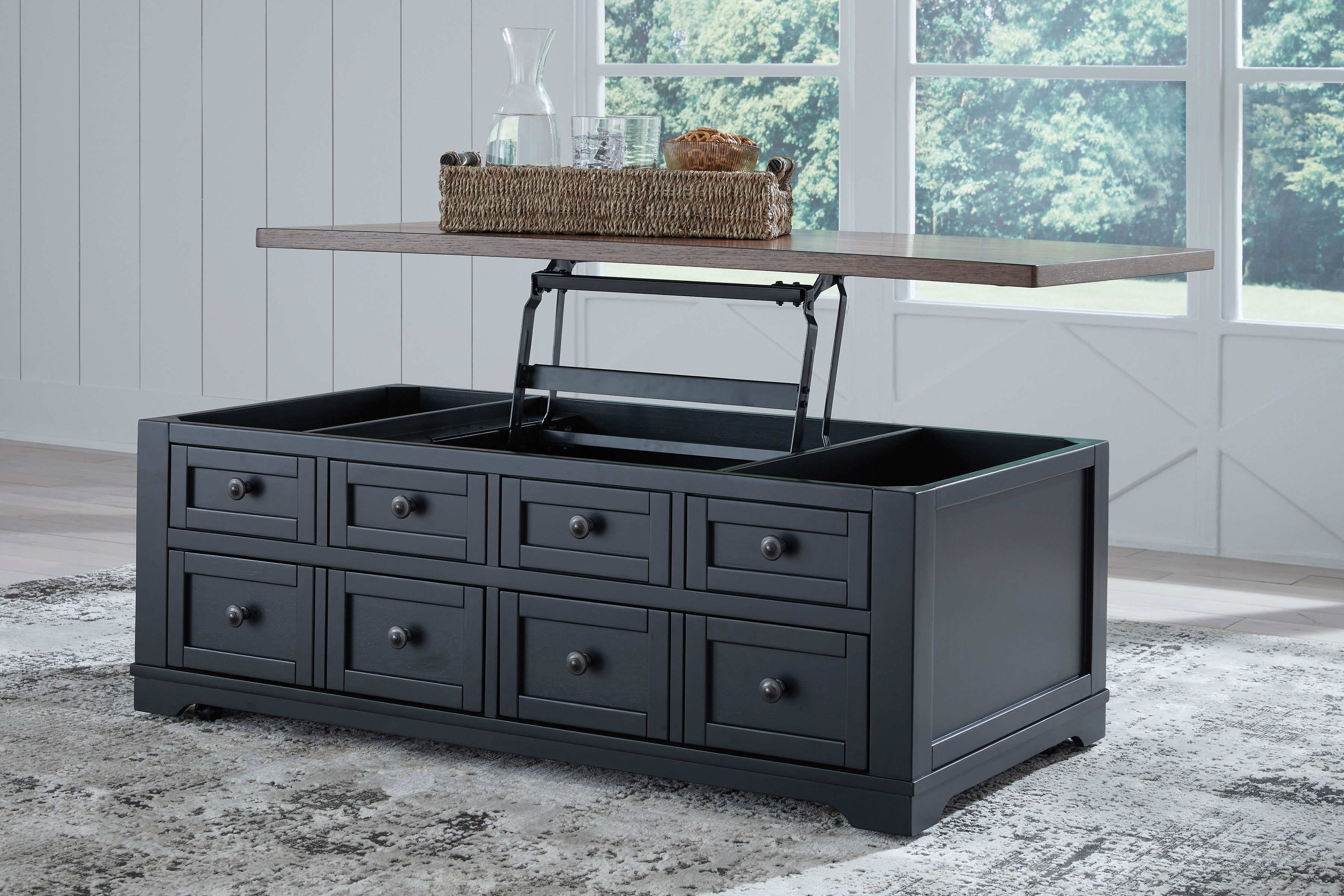 Raise the bar on modern farmhouse style with this lift-top coffee table. Its sturdy silhouette and casual good looks are accentuated with a two-tone finish, which pairs a warm satin black base with a contrasting butcher block veneer top. Combining form and function, its lift top extends for a casual dinner or extra work space in front of your sofa. Two spacious lower drawers and handy storage bins under the top make this piece awfully useful, too. Whether your style is vintage, country or eclectic, this table adds a hearty element.