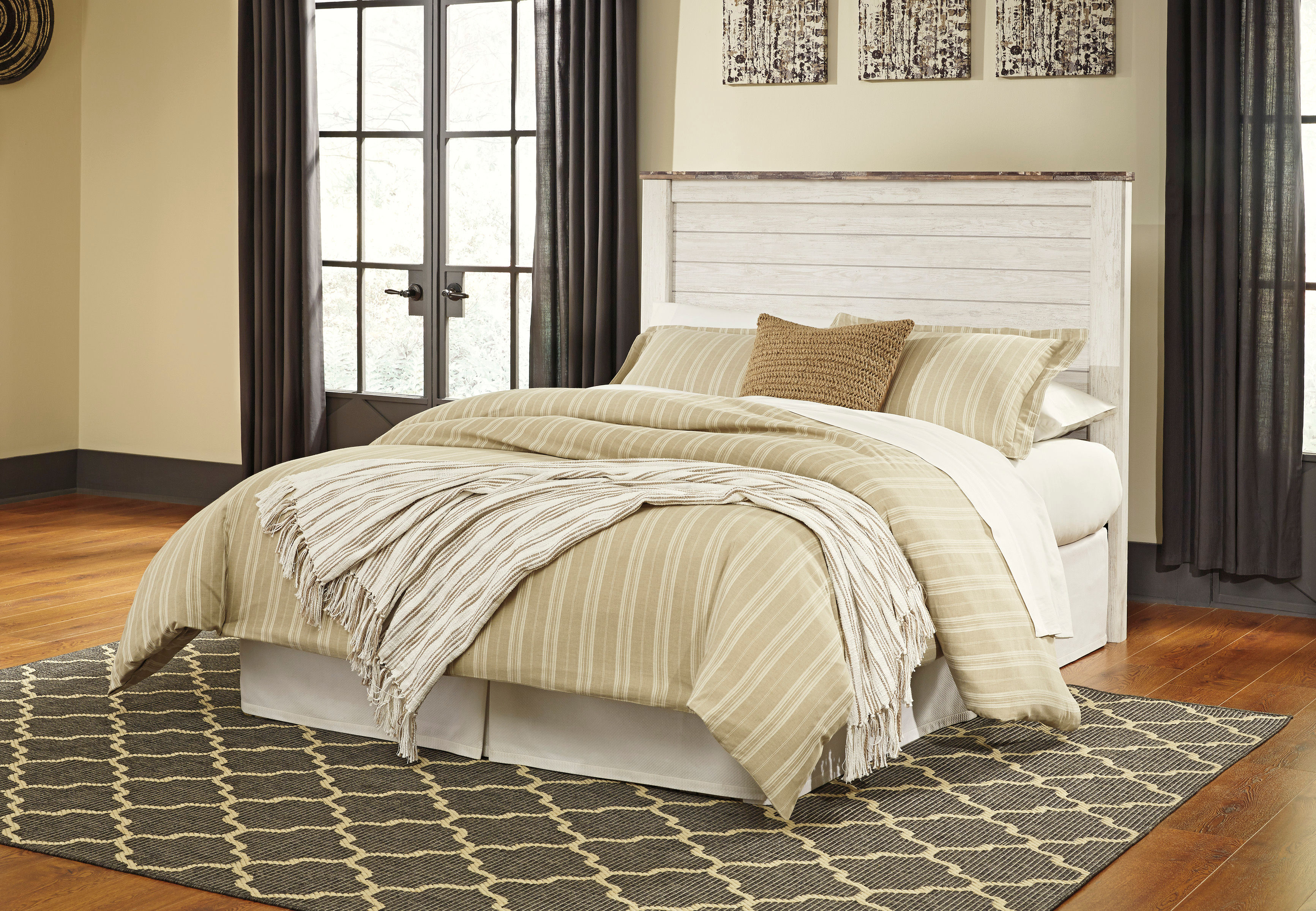 The ultimate look for a beach cottage or shabby chic inspired retreat, the Willowton queen panel headboard carries you away to a dreamy time and place. Its driftwoody whitewash finish is wonderfully easy on the eyes. Faux plank detailing incorporates a classically rustic touch that’s so homey and comforting. Mattress, bed frame and foundation/box spring sold separately.