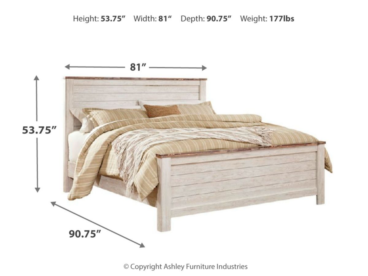 The ultimate look for a beach cottage or shabby chic inspired retreat, the Willowton king panel bed carries you away to a dreamy time and place. Its driftwoody whitewash finish is wonderfully easy on the eyes. Faux plank detailing incorporates a classically rustic touch that's so homey and comforting. Mattress and foundation/box spring sold separately