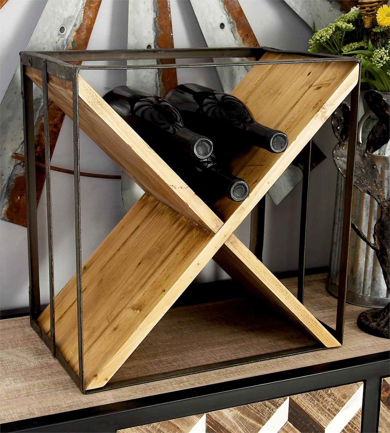 Embrace artistic expression with a style that highlights bold designs with sleek lines, neutral elements, and a minimalist aesthetic. The durable frame is iron, and the two rectangular wood pieces forming an "X" are pine wood. Wine rack features a warm, oiled brown finish contrasted with industrial look of the black metal frame, creating a stylish and modern aesthetic. Two rectangular wood pieces clasp each other at the middle sections to form an "X" that cradles 9 wine bottles.