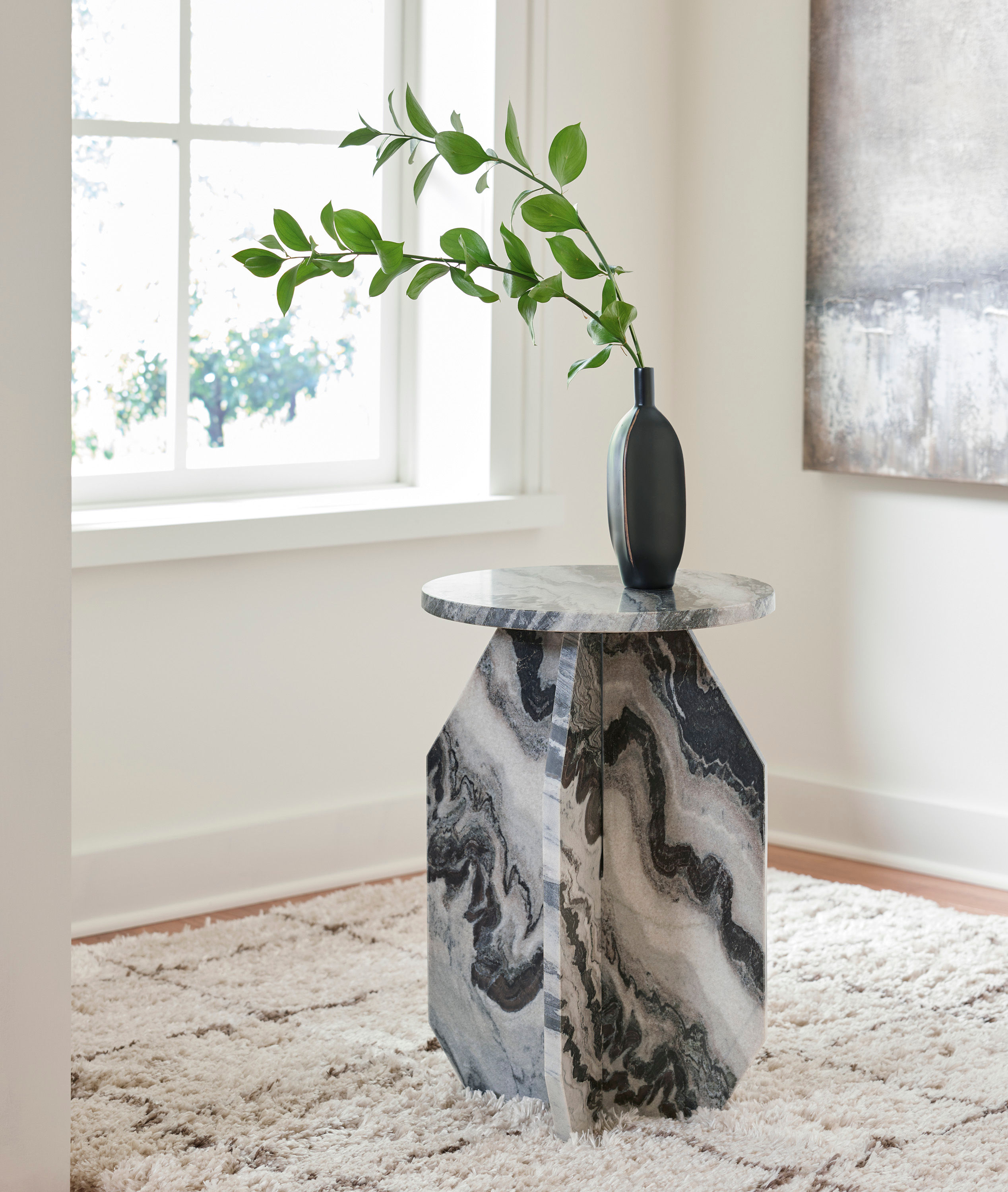 Make a big impact with this stunning accent table. The elegant all-marble construction and sculptural base create a contemporary aesthetic that's sure to make an impression. It's drop-dead gorgeous and functional, completing your seating arrangement with sophisticated style.