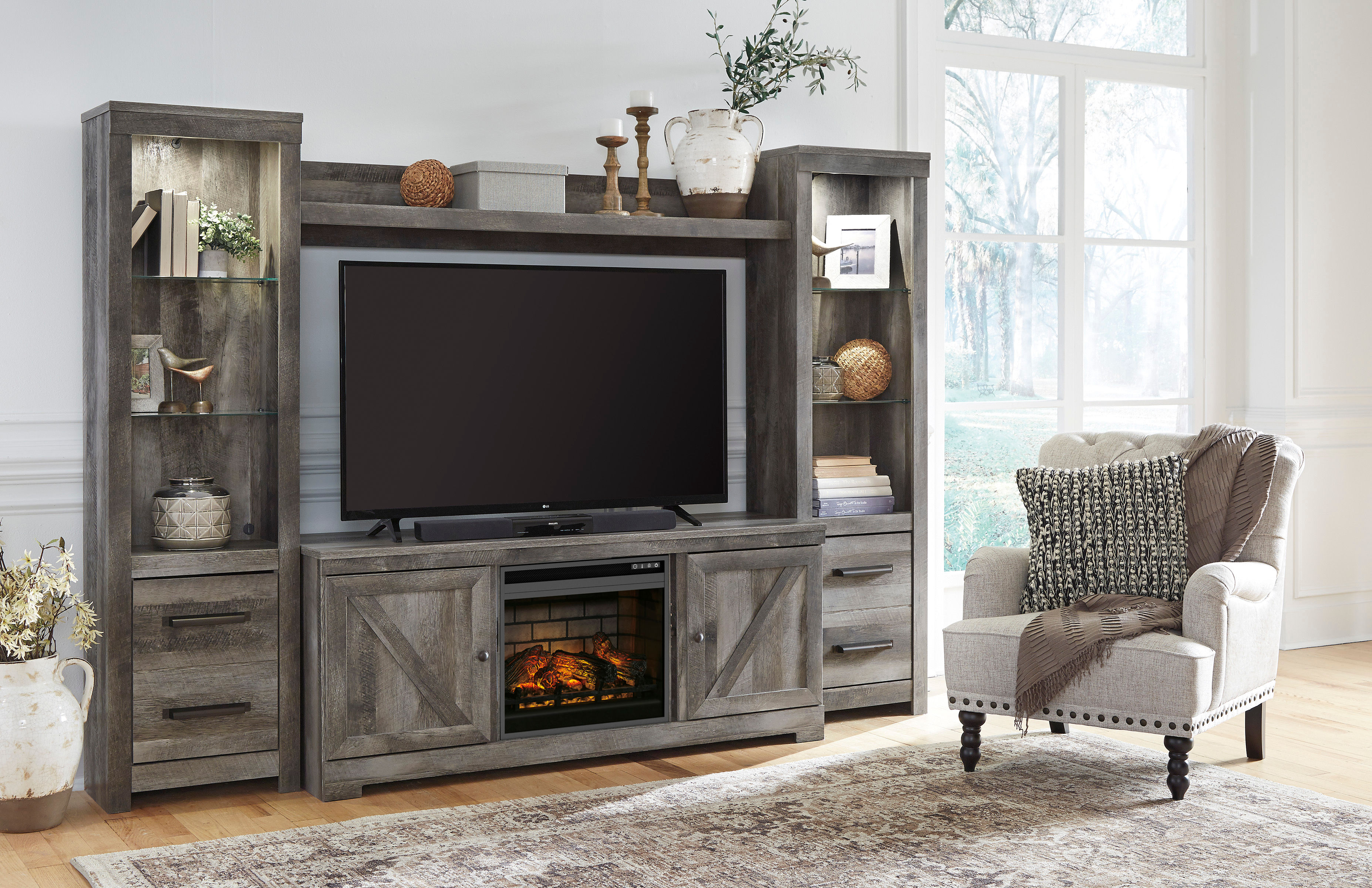 The Wynnlow entertainment center with fireplace insert is sure to win your heart with its daring designer take on modern rustic. Its crisp, clean and minimalist-chic profile is enriched with a striking replicated oak grain with thick plank styling and a weathered gray finish for that much more authentic character. Crossbuck detailing adds a brilliant barn door inspired touch. Adding that much more show-stopping style: an electric fireplace insert that operates with or without heat.