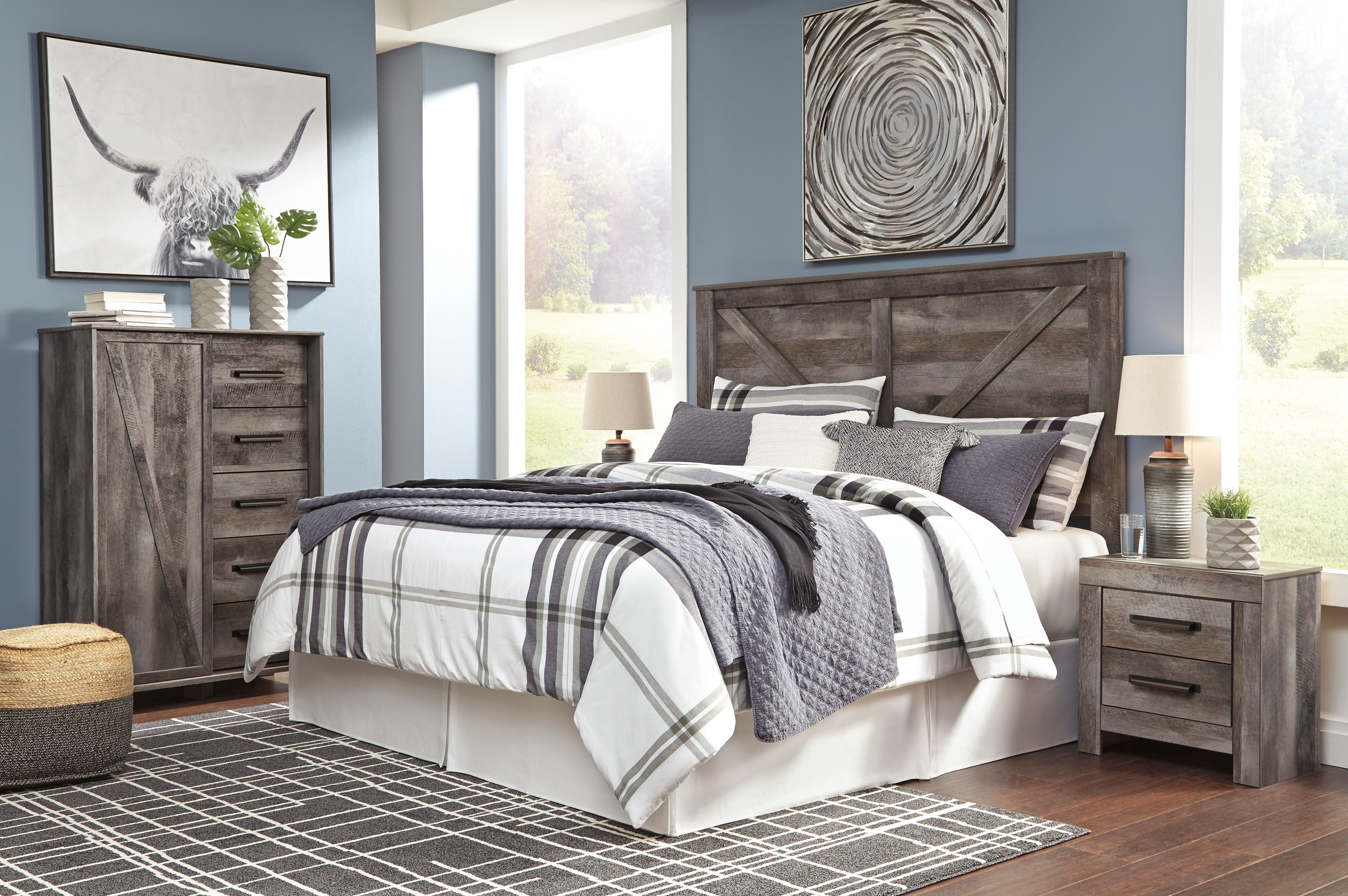 This king crossbuck panel headboard is sure to win your heart with its daring designer take on modern rustic. This headboard's crisp, clean and minimalist-chic profile is enriched with a striking replicated oak grain with thick plank styling and a weathered gray finish for that much more authentic character.
