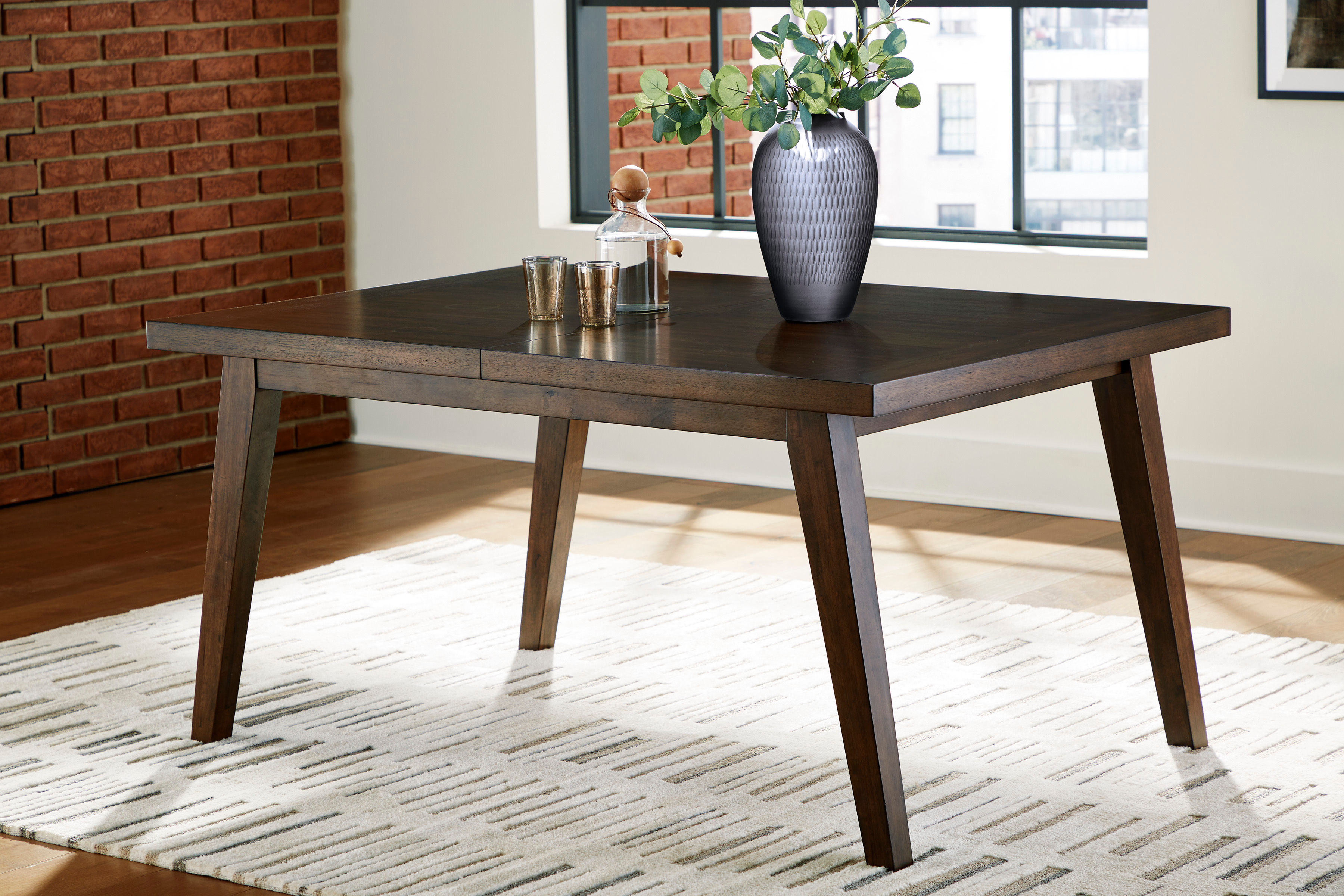 The beauty of the Zumbado dining table with a walnut finish adds a sleek aesthetic and can be extended.