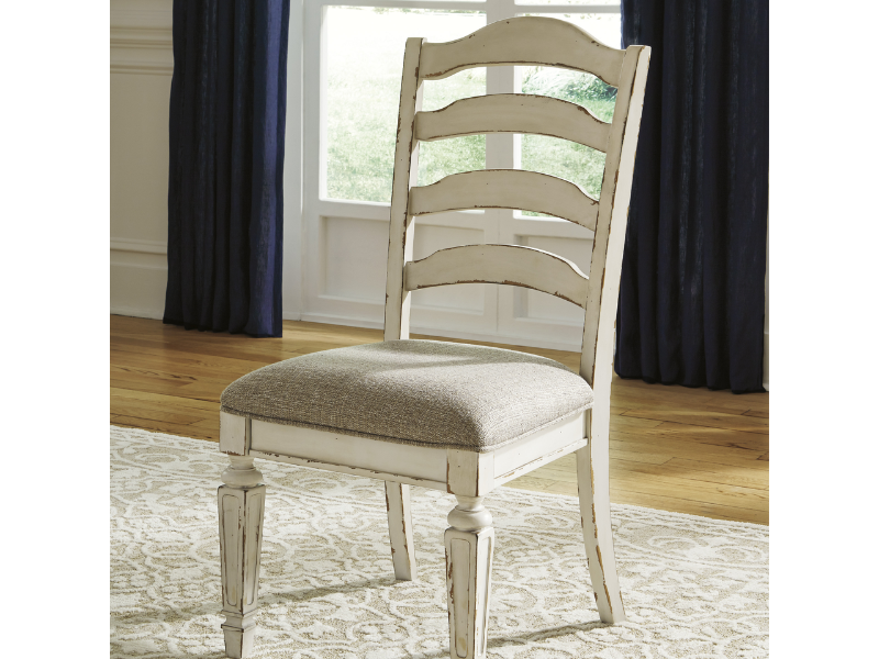 Bon appétit. With its rounded ladderback styling, chipped white finish and plushly cushioned seat, the Realyn dining room chair has all the right ingredients for a French country-inspired feast for the eyes.